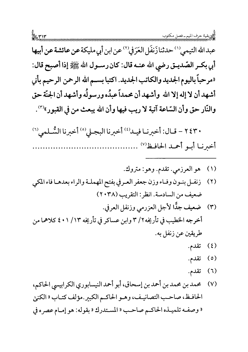 عبد الله التيمى (¬١) حدثنا زَنفَل العَرَفي (¬٢) عن ابن أبي مليكة عن عائشة عن أبيها أبي بكر الصّديق رَضِيَ اللَّهُ عَنْهُ قال: كان رسول الله -صَلَّى اللهُ عَلَيْهِ وَسَلَّمَ- إذا أصبح قال: "مرحبًا باليوم الجديد والكاتب الجديد. اكتبا بسم الله الر حمن الرحيم بأني أشهد أن لا إله إلا الله وأشهد أن محمدًا عبدُه ورسولُه وأشهد أن الجنّة حق والنّار حق وأن السّاعة آتية لا ريب فيها وأن الله يبعث من في القبور" (¬٣).