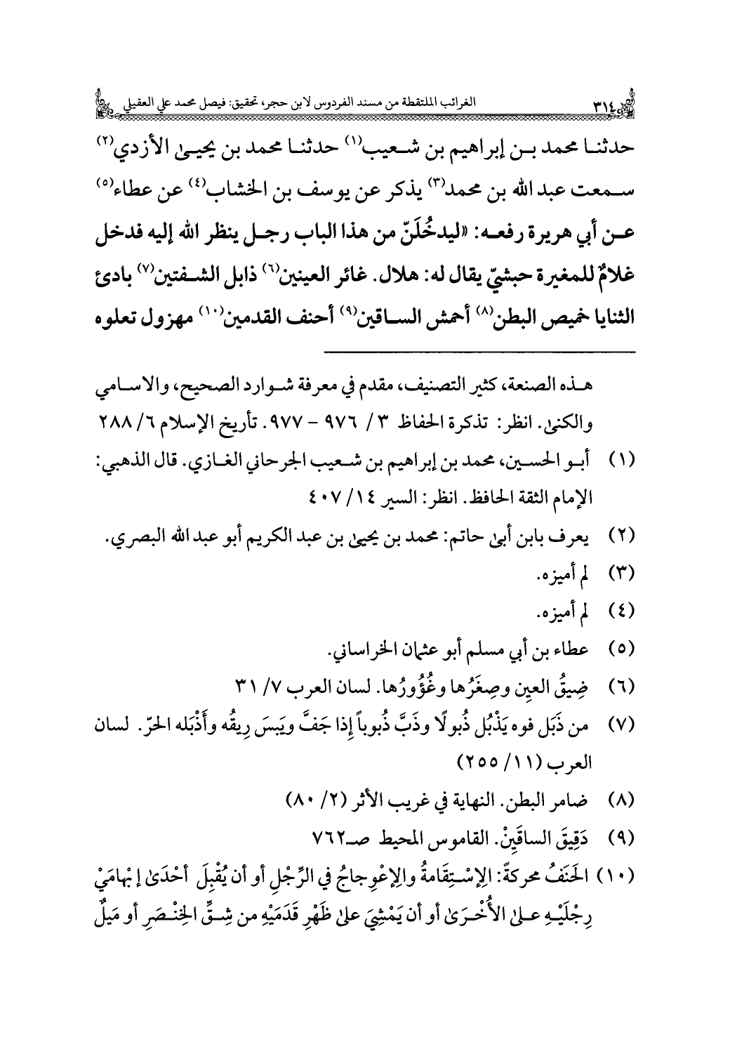 حدثنا محمد بن إبراهيم بن شعيب (¬١) حدثنا محمد بن يحيى الأزدي (¬٢) سمعت عبد الله بن محمد (¬٣) يذكر عن يوسف بن الخشاب (¬٤) عن عطاء (¬٥) عن أبي هريرة رفعه: "ليدخُلَنّ من هذا الباب رجل ينظر الله إليه فدخل غلامٌ للمُغِيْرَة حبشيّ يقال له: هلال. غائر العينين (¬٦) ذابل الشفتين (¬٧) بادئ الثنايا خميص البطن (¬٨) أحمش الساقين (¬٩) أحنف القدمين (¬١٠) مهزول تعلوه