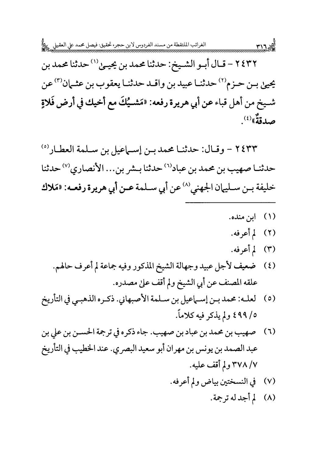 ٢٤٣٢ - قال أبو الشيخ: حدثنا محمد بن يحيى (¬١) حدثنا محمد بن يحيى بن حزم (¬٢) حدثنا عبيد بن واقد حدثنا يعقوب بن عثمان (¬٣) عن شيخ من أهل قباء عن أبي هريرة رفعه: "مَشيُكَ مع أخيك في أرض فَلاةٍ صدقةٌ" (¬٤).