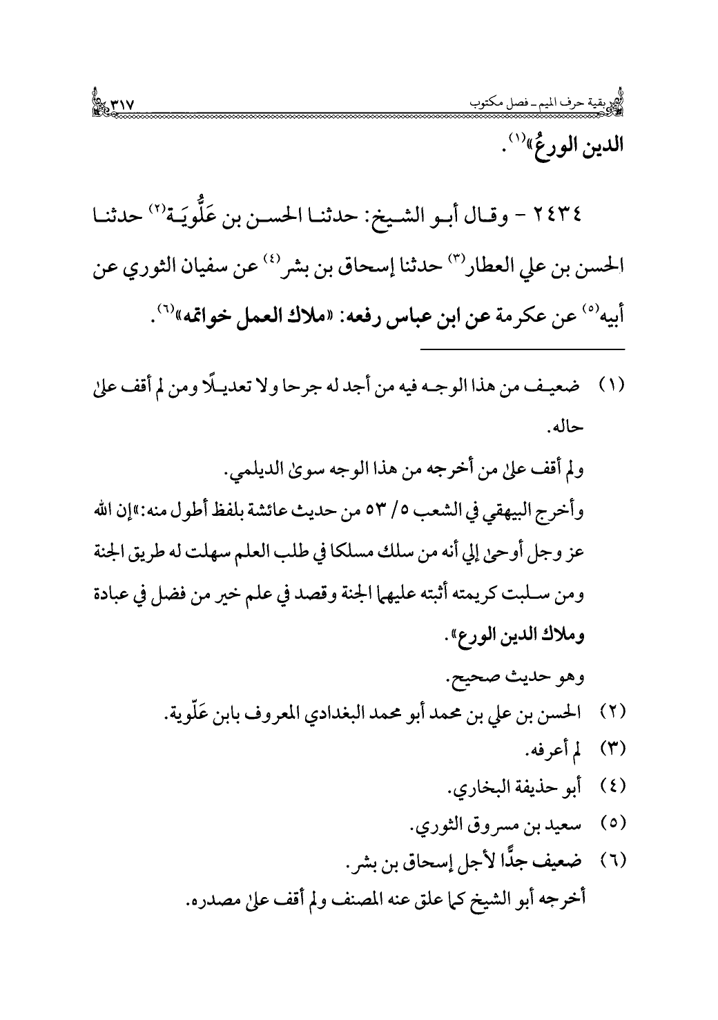 ٢٤٣٤ - وقال أبو الشيخ: حدثنا الحسن بن عَلُّويَة (¬٢) حدثنا الحسن بن علي العطار (¬٣) حدثنا إسحاق بن بشر (¬٤) عن سفيان الثوري عن أبيه (¬٥) عن عكرمة عن ابن عباس رفعه: "ملاك العمل خواتمه" (¬٦).