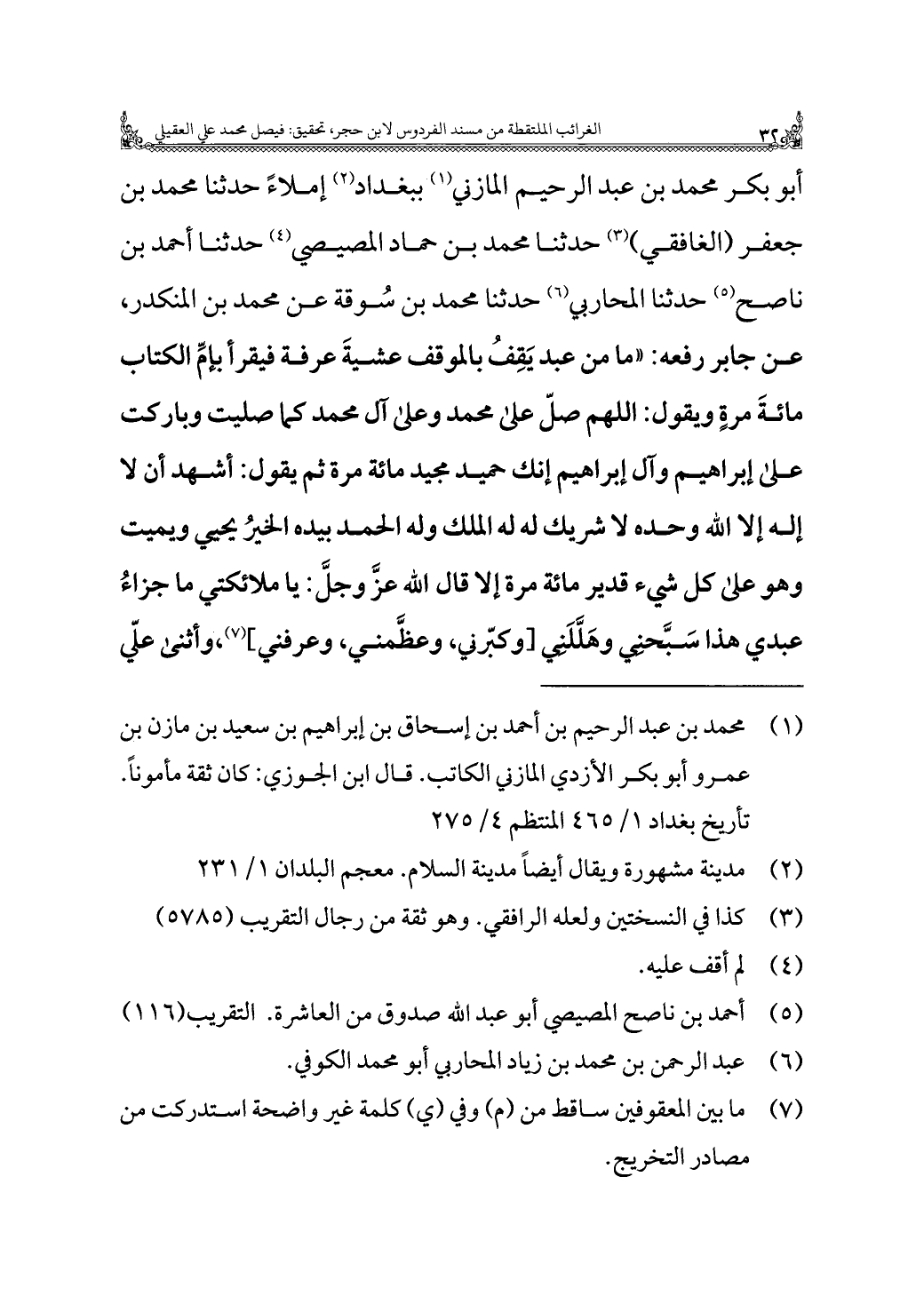 أبو بكر محمد بن عبد الرحيم المازني (¬١) ببغداد (¬٢) إملاءً حدثنا محمد بن جعفر (الغافقي) (¬٣) حدثنا محمد بن حماد المصيصى (¬٤) حدثنا أحمد بن ناصح (¬٥) حدثنا المحاربي (¬٦) حدثنا محمد بن سُوقة عن محمد بن المنكدر، عن جابر رفعه: "ما من عبد يَقِفُ بالموقف عشيةَ عرفة فيقرأ بإمِّ الكتاب مائةَ مرةٍ ويقول: اللهم صلّ علي محمد وعلي آل محمد كلما صليت وباركت علي إبراهيم وآل إبراهيم إنك حميد مجيد مائة مرة ثم يقول: أشهد أن لا إله إلا الله وحده لا شريك له له الملك وله الحمد بيده الخيرُ يحيي ويميت وهو علي كل شيء قدير مائة مرة إلا قال الله عزَّ وجلَّ: يا ملائكتي ما جزاءُ عبدي هذا سَبَّحنِي وهَلَّلنِي [وكبّرني، وعظَّمني، وعرفني] (¬٧)، وأثنى علّي