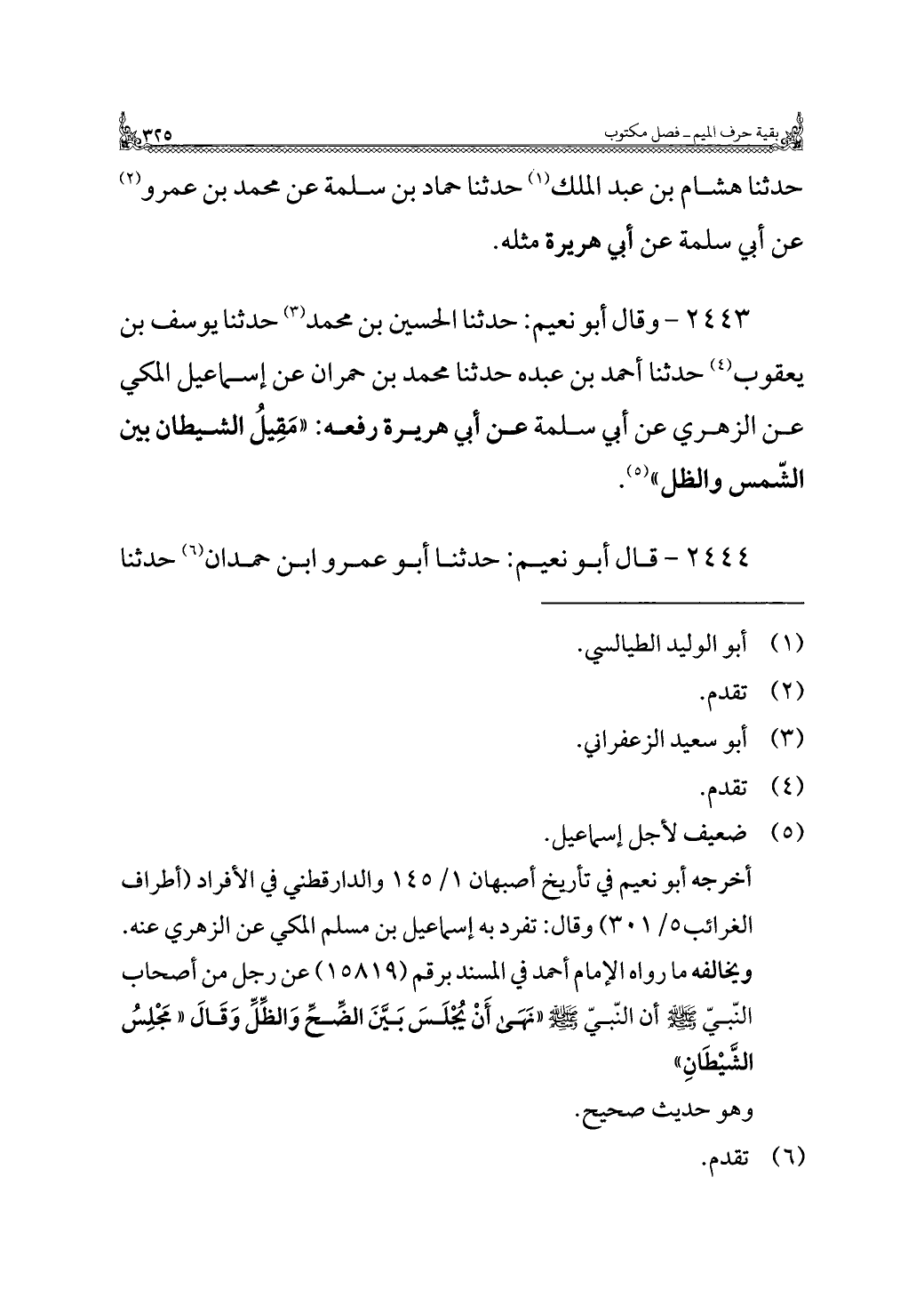 ٢٤٤٣ - وقال أبو نعيم: حدثنا الحسين بن محمد (¬٣) حدثنا يوسف بن يعقوب (¬٤) حدثنا أحمد بن عبده حدثنا محمد بن حمران عن إسماعيل المكي عن الزهري عن أبي سلمة عن أبي هريرة رفعه: "مَقِيلُ الشيطان بين الشّمس والظل" (¬٥).