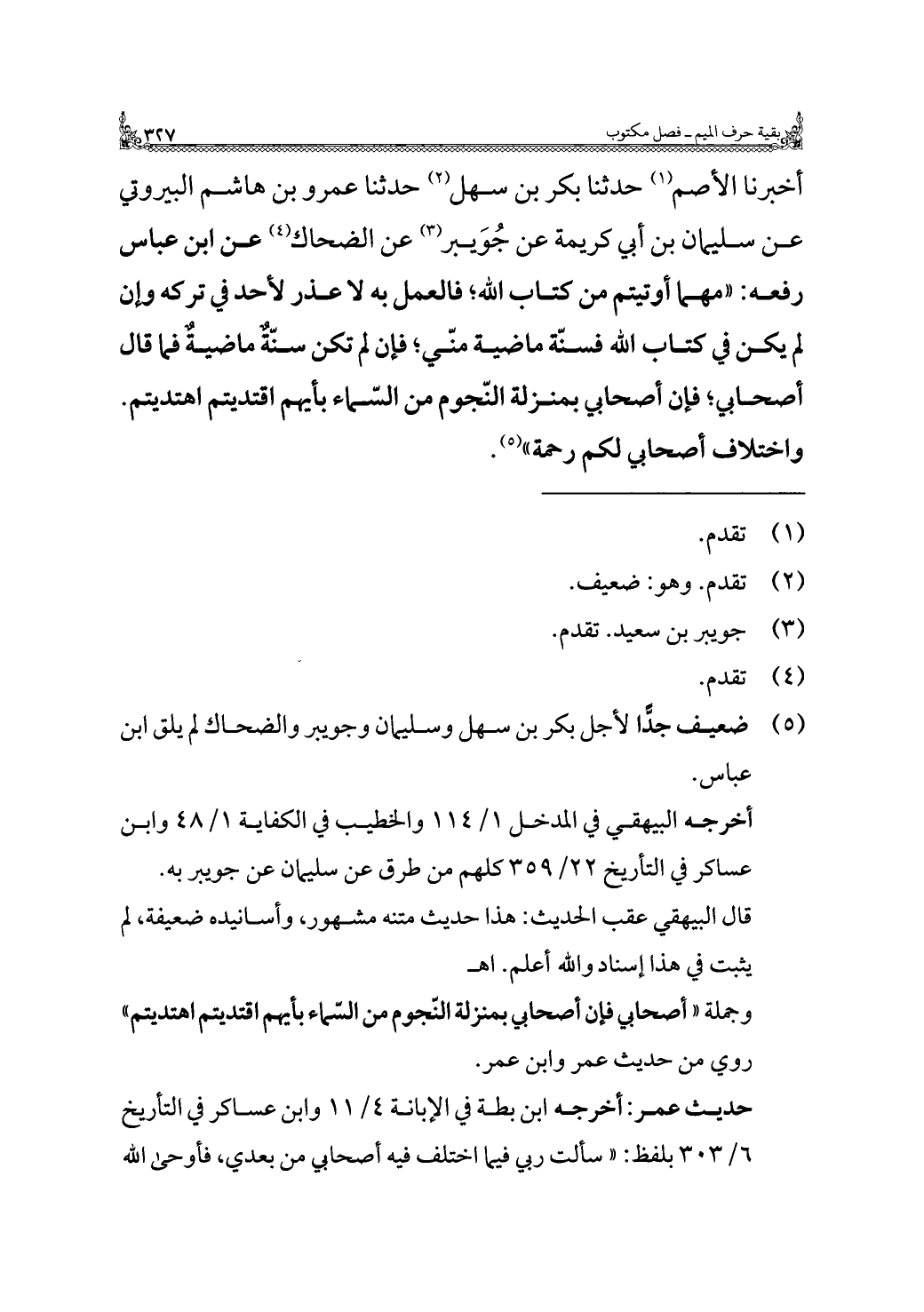 أخبرنا الأصم (¬١) حدثنا بكر بن سهل (¬٢) حدثنا عمرو بن هاشم البيروتي عن سليمان بن أبي كريمة عن جُوَيبر (¬٣) عن الضحاك (¬٤) عن ابن عباس رفعه: "مهما أوتيتم من كتاب الله؛ فالعمل به لا عذر لأحد في تركه وإن لم يكن في كتاب الله فسنّة ماضية منّي؛ فإن لم تكن سنّةٌ ماضيةٌ فما قال أصحابي؛ فإن أصحابي بمنزلة النّجوم من السّماء بأيهم اقتديتم اهتديتم. واختلاف أصحابي لكم رحمة" (¬٥).