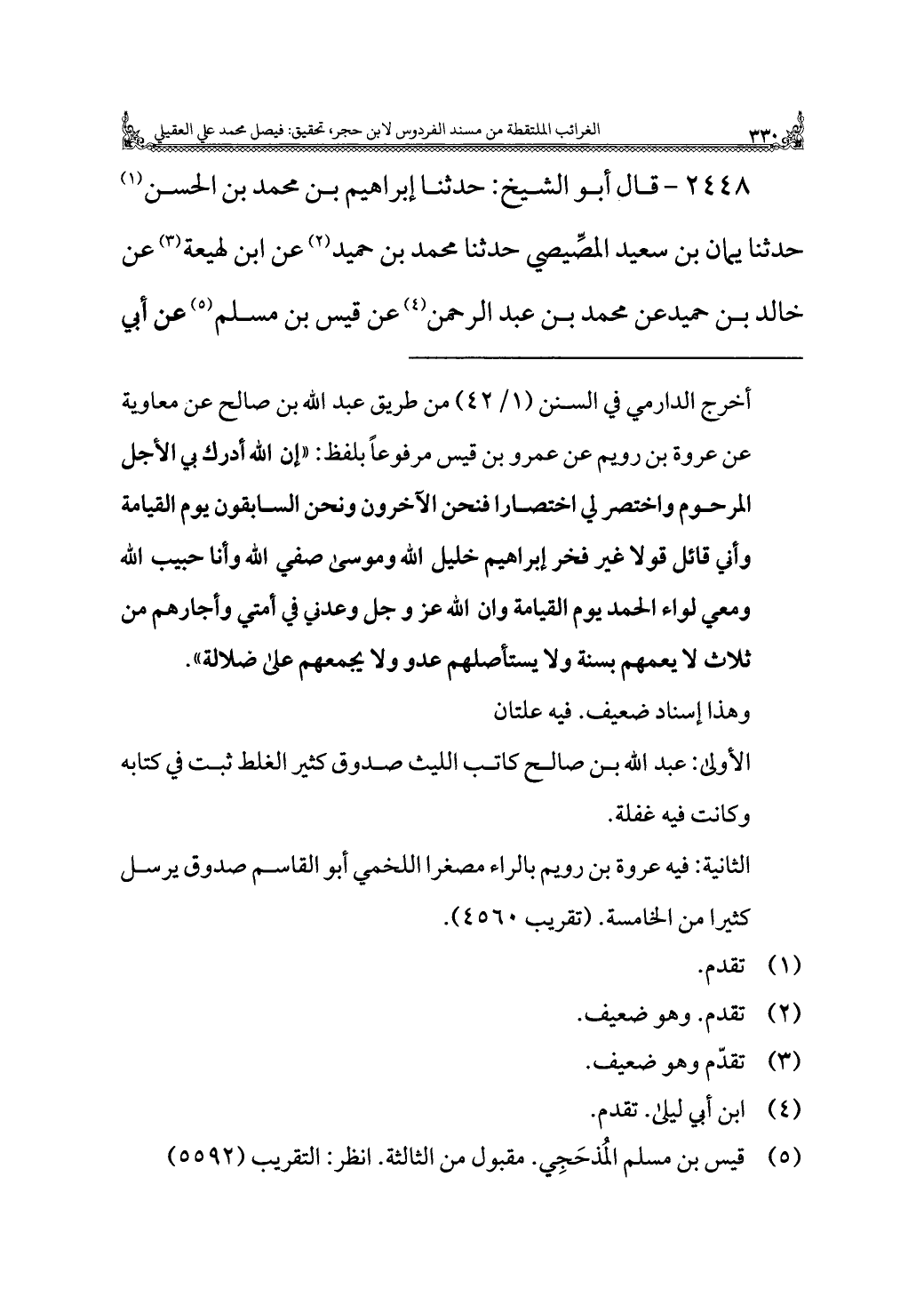 ٢٤٤٨ - قال أبو الشيخ: حدثنا إبراهيم بن محمد بن الحسن (¬١) حدثنا يمان بن سعيد المصِّيصي حدثنا محمد بن حميد (¬٢) عن ابن لهيعة (¬٣) عن خالد بن حميد عن محمد بن عبد الرحمن (¬٤) عن قيس بن مسلم (¬٥) عن أبي