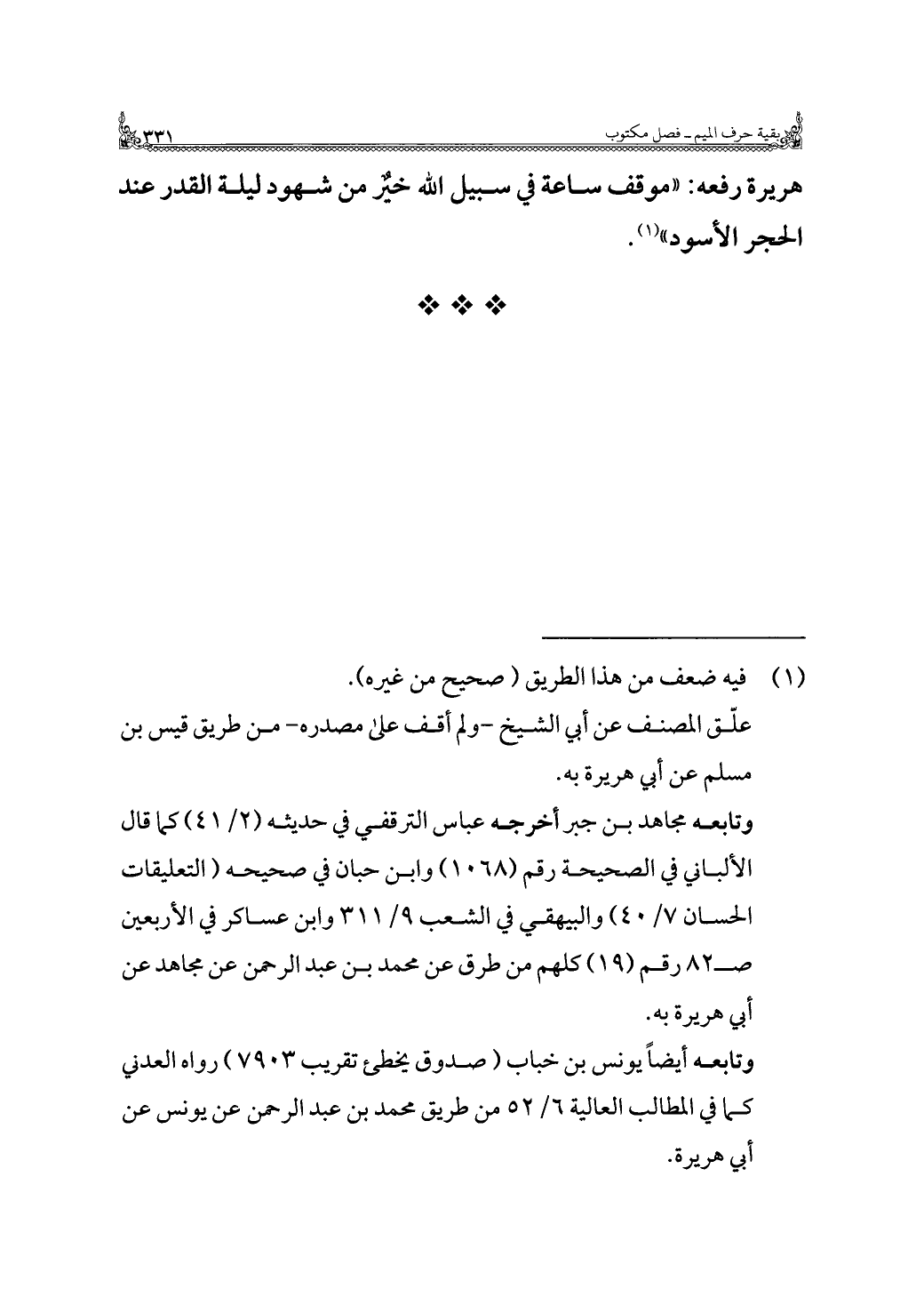 هريرة رفعه: "موقف ساعة في سبيل الله خيرٌ من شهود ليلة القدر عند الحجر الأسود" (¬١).