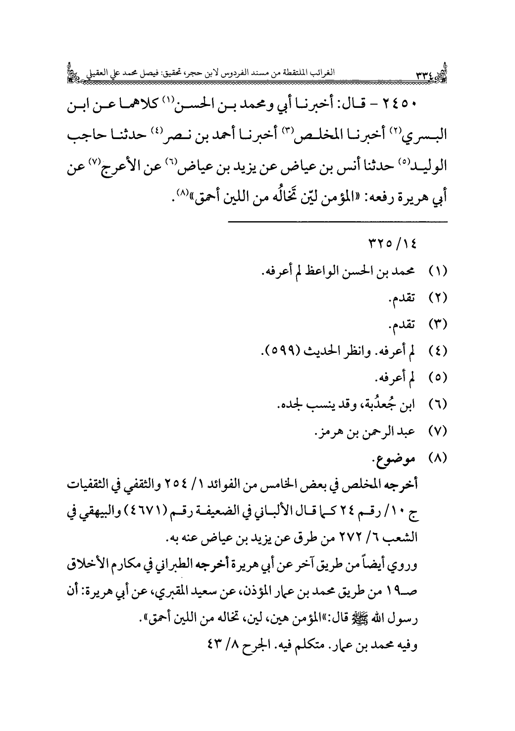 ٢٤٥٠ - قال: أخبرنا أبي ومحمد بن الحسن (¬١) كلاهما عن ابن البسري (¬٢) أخبرنا المخلص (¬٣) أخبرنا أحمد بن نصر (¬٤) حدثنا حاجب الوليد (¬٥) حدثنا أنس بن عياض عن يزيد بن عياض (¬٦) عن الأعرج (¬٧) عن أبي هريرة رفعه: "المؤمن ليّن تَخالُه من اللين أحمق" (¬٨).