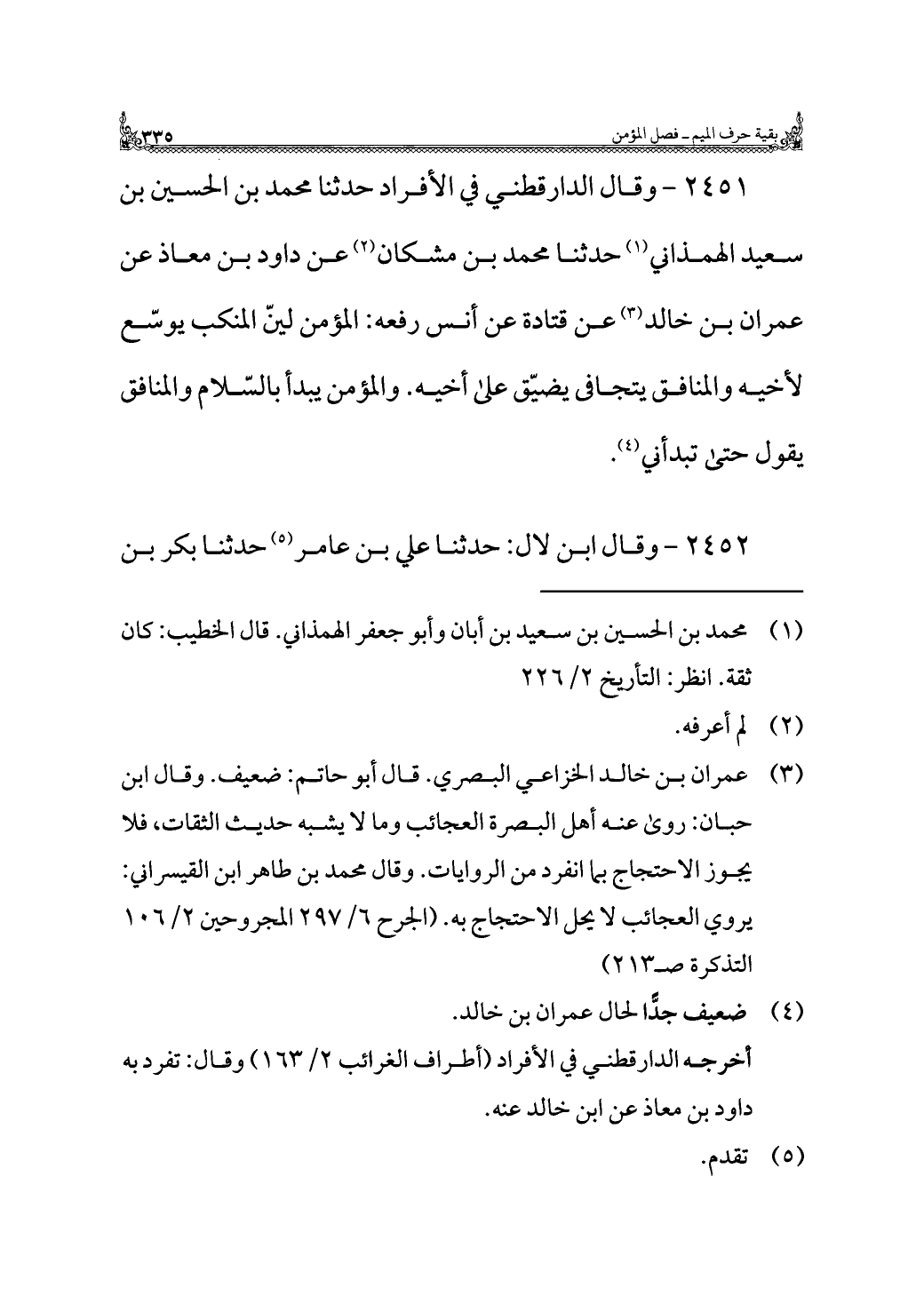 ٢٤٥١ - وقال الدارقطني في الأفراد حدثنا محمد بن الحسين بن سعيد الهمذاني (¬١) حدثنا محمد بن مشكان (¬٢) عن داود بن معاذ عن عمران بن خالد (¬٣) عن قتادة عن أنس رفعه: المؤمن لينّ المنكب يوسّع لأخيه والمنافق يتجافى يضيّق على أخيه. والمؤمن يبدأ بالسّلام والمنافق يقول حتى تبدأني (¬٤).