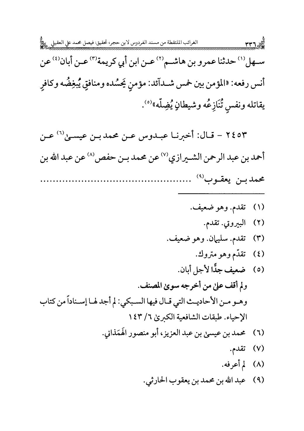 ٢٤٥٣ - قال: أخبرنا عبدوس عن محمد بن عيسى (¬٦) عن أحمد بن عبد الرحمن الشيرازي (¬٧) عن محمد بن حفص (¬٨) عن عبد الله بن محمد بن يعقوب (¬٩) .............................................................