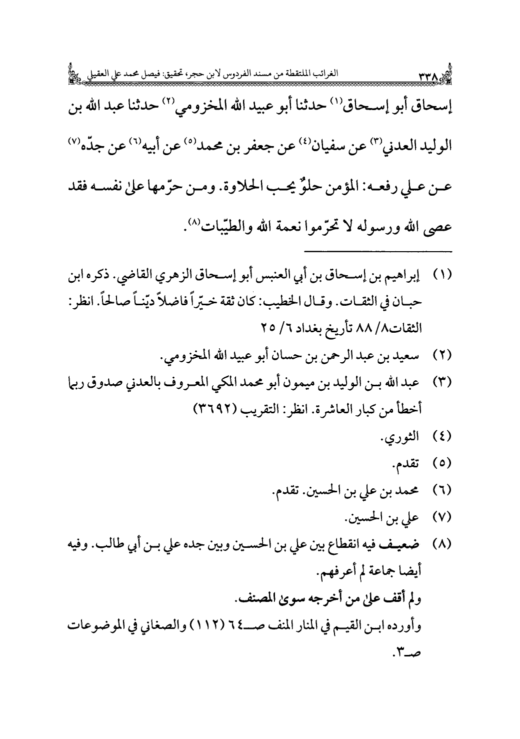 إسحاق أبو إسحاق (¬١) حدثنا أبو عبيد الله المخزومي (¬٢) حدثنا عبد الله بن الوليد العدني (¬٣) عن سفيان (¬٤) عن جعفر بن محمد (¬٥) عن أبيه (¬٦) عن جدّه (¬٧) عن علي رفعه: المؤمن حلوٌ يحب الحلاوة. ومن حرّمها على نفسه فقد عصى الله ورسوله لا تحرّموا نعمة الله والطيّبات (¬٨).