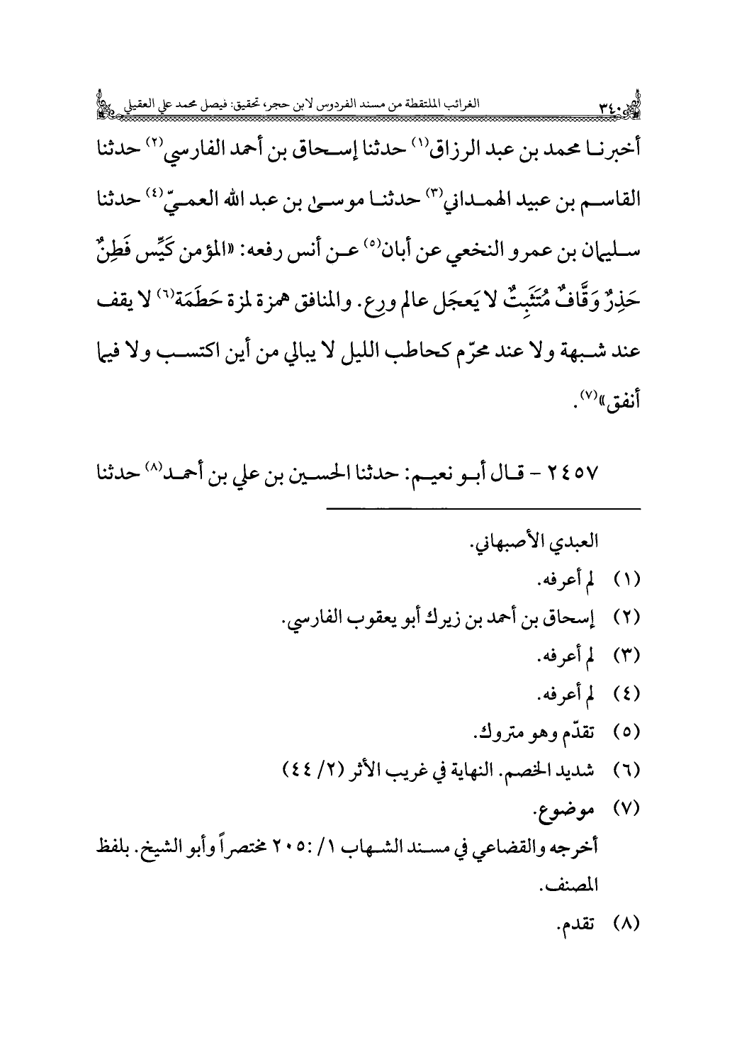 أخبرنا محمد بن عبد الرزاق (¬١) حدثنا إسحاق بن أحمد الفارسي (¬٢) حدثنا القاسم بن عبيد الهمداني (¬٣) حدثنا موسى بن عبد الله العميّ (¬٤) حدثنا سليمان بن عمرو النخعي عن أبان (¬٥) عن أنس رفعه: "المؤمن كَيِّس فَطِنٌ حَذِرٌ وَقَّافٌ مُتَثَبِتٌ لا يَعجَل عالم ورع. والمنافق همزة لمزة حَطَمَة (¬٦) لا يقف عند شبهة ولا عند محرّم كحاطب الليل لا يبالي من أين اكتسب ولا فيما أنفق" (¬٧).