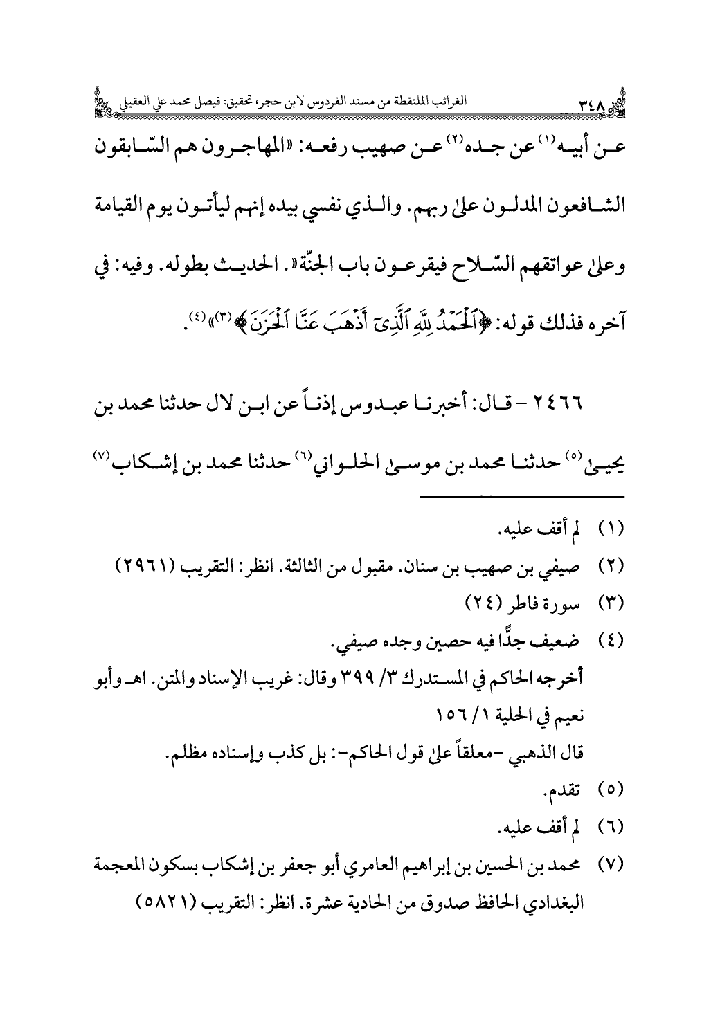 عن أبيه (¬١) عن جده (¬٢) عن صهيب رفعه: "المهاجرون هم السّابقون الشافعون المدلون على ربهم. والذي نفسي بيده إنهم ليأتون يوم القيامة وعلى عواتقهم السّلاح فيقرعون باب الجنّة ". الحديث بطوله. وفيه: في آخره فذلك قوله: {الْحَمْدُ لِلَّهِ الَّذِي أَذْهَبَ عَنَّا الْحَزَنَ} (¬٣) " (¬٤).