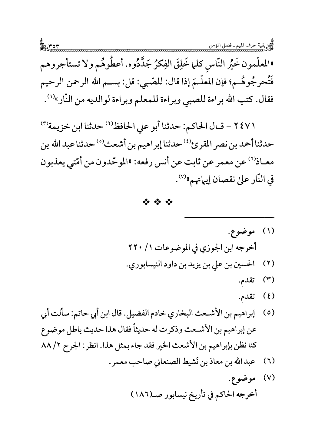 ٢٤٧١ - قال الحاكم: حدثنا أبو علي الحافظ (¬٢) حدثنا ابن خزيمة (¬٣) حدثنا أحمد بن نصر المقرئ (¬٤) حدثنا إبراهيم بن أشعث (¬٥) حدثنا عبد الله بن معاذ (¬٦) عن معمر عن ثابت عن أنس رفعه: "الموحّدون من أمّتي يعذبون في النّار على نقصان إيمانهم" (¬٧).