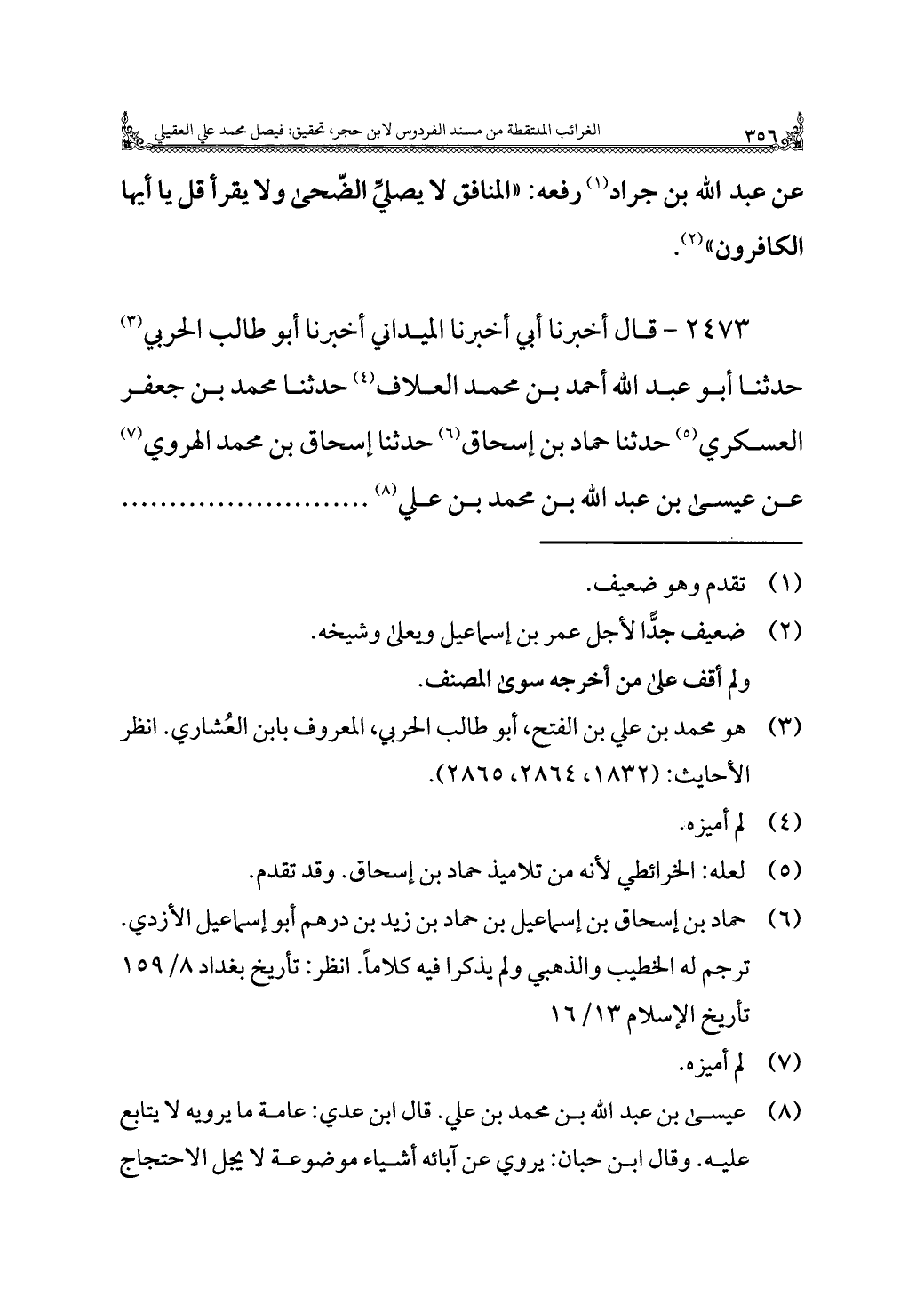 ٢٤٧٣ - قال أخبرنا أبي أخبرنا الميداني أخبرنا أبو طالب الحربي (¬٣) حدثنا أبو عبد الله أحمد بن محمد العلاف (¬٤) حدثنا محمد بن جعفر العسكري (¬٥) حدثنا حماد بن إسحاق (¬٦) حدثنا إسحاق بن محمد الهروي (¬٧) عن عيسى بن عبد الله بن محمد بن علي (¬٨) ........................................
