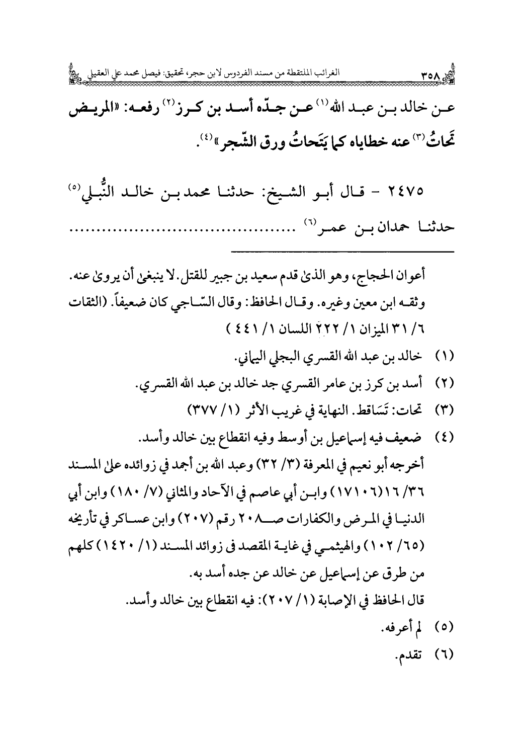 أخرجه أبو نعيم في المعرفة (٣/ ٣٢) وعبد الله بن أجمد في زوائده على المسند ٣٦/ ١٦ (١٧١٠٦) وابن أبي عاصم في الآحاد والمثاني (٧/ ١٨٠) وابن أبي الدنيا في المرض والكفارات صـ ٢٠٨ رقم (٢٠٧) وابن عساكر في تأريخه (٦٥/ ١٠٢) والهيثمي في غاية المقصد فى زوائد المسند (١/ ١٤٢٠) كلهم من طرق عن إسماعيل عن خالد عن جده أسد به.