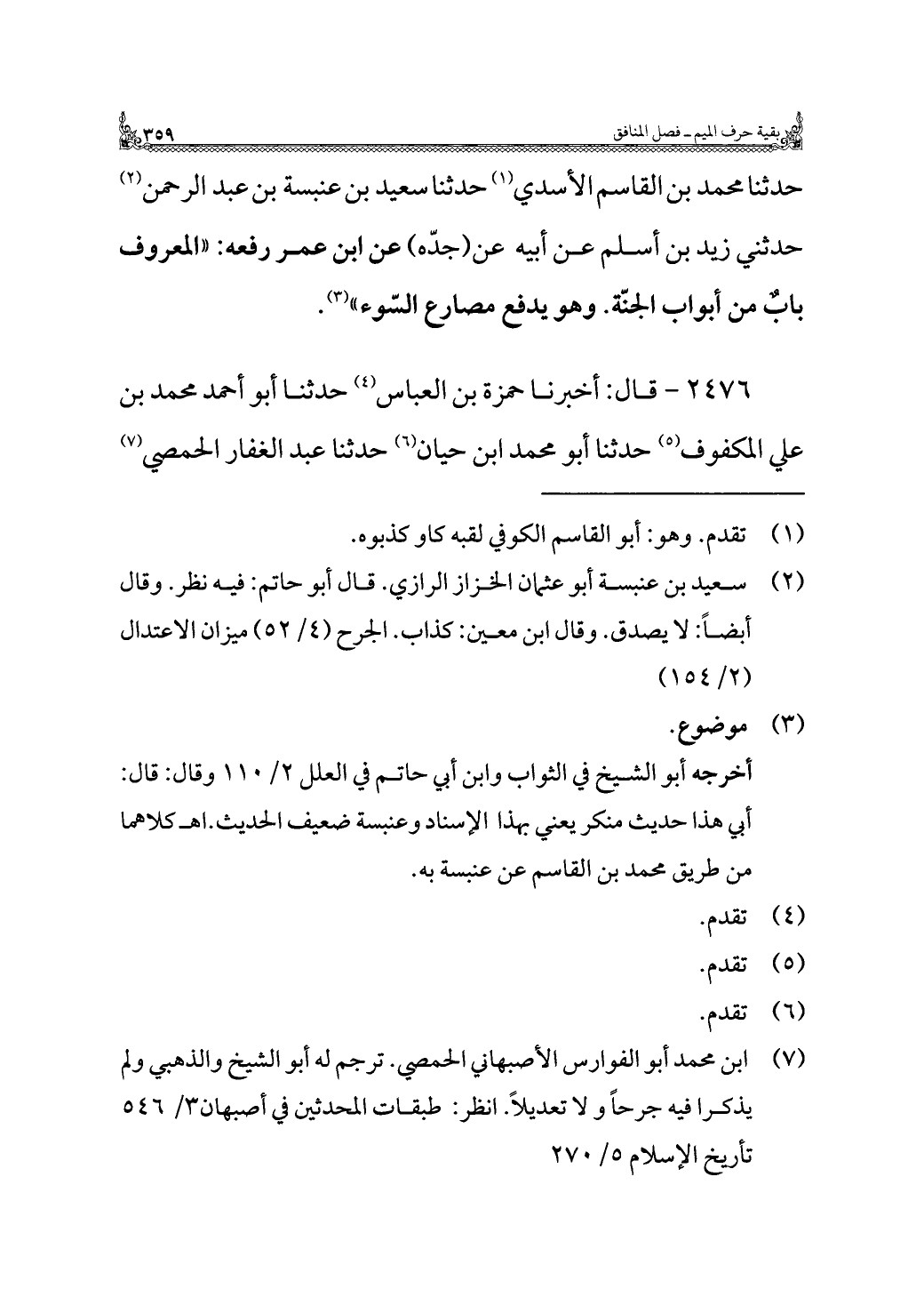 ٢٤٧٦ - قال: أخبرنا حمزة بن العباس (¬٤) حدثنا أبو أحمد محمد بن علي المكفوف (¬٥) حدثنا أبو محمد ابن حيان (¬٦) حدثنا عبد الغفار الحمصي (¬٧)