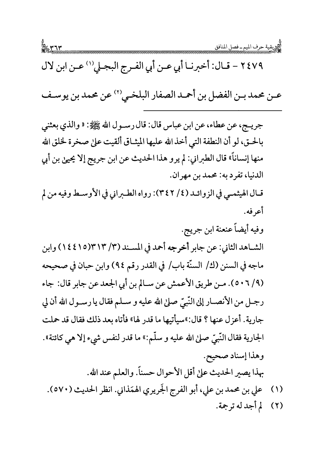 ٢٤٧٩ - قال: أخبرنا أبي عن أبي الفرج البجلي (¬١) عن ابن لال عن محمد بن الفضل بن أحمد الصفار البلخي (¬٢) عن محمد بن يوسف