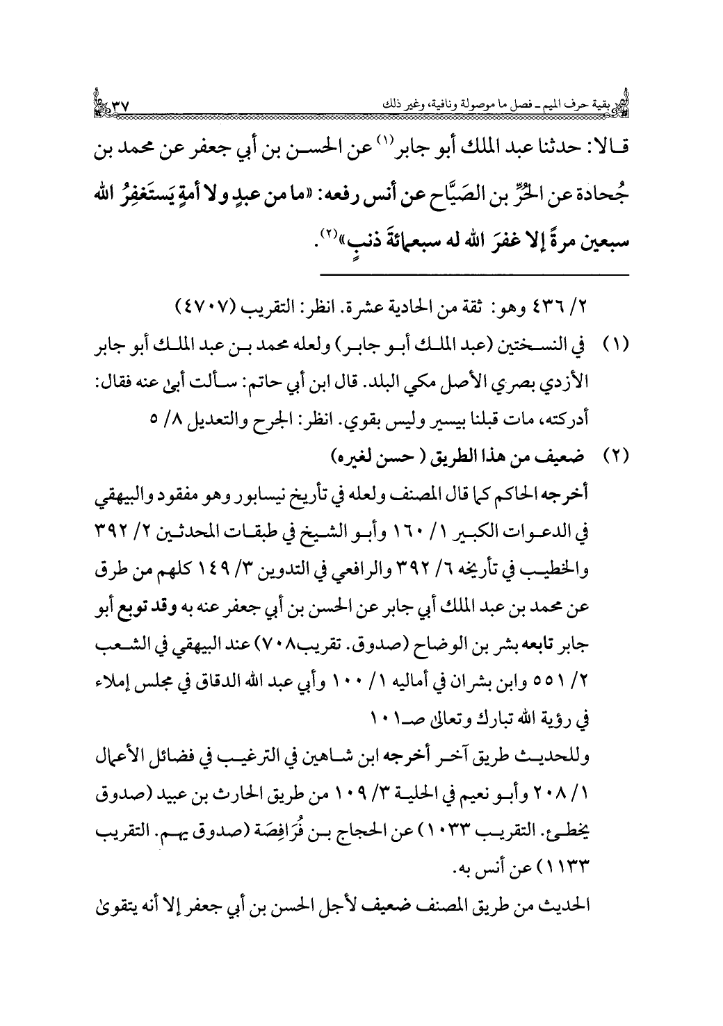 قالا: حدثنا عبد الملك أبو جابر (¬١) عن الحسن بن أبي جعفر عن محمد بن جُحادة عن الحُرِّ بن الصَيَّاح عن أنس رفعه: "ما من عبدٍ ولا أمةٍ يَستَغفِرُ الله سبعين مرةً إلا غفرَ الله له سبعمائةَ ذنبٍ" (¬٢).