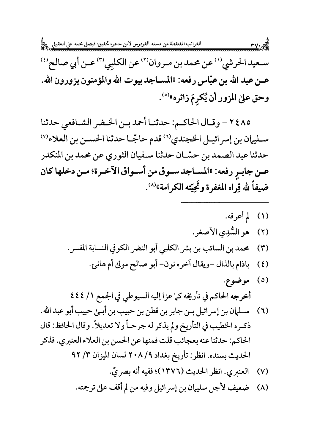 سعيد الحرشي (¬١) عن محمد بن مروان (¬٢) عن الكلبِي (¬٣) عن أبي صالح (¬٤) عن عبد الله بن عبّاس رفعه: "المساجد بيوت الله والمؤمنون يزورون الله. وحق علي المزور أن يُكرِمَ زائره" (¬٥).