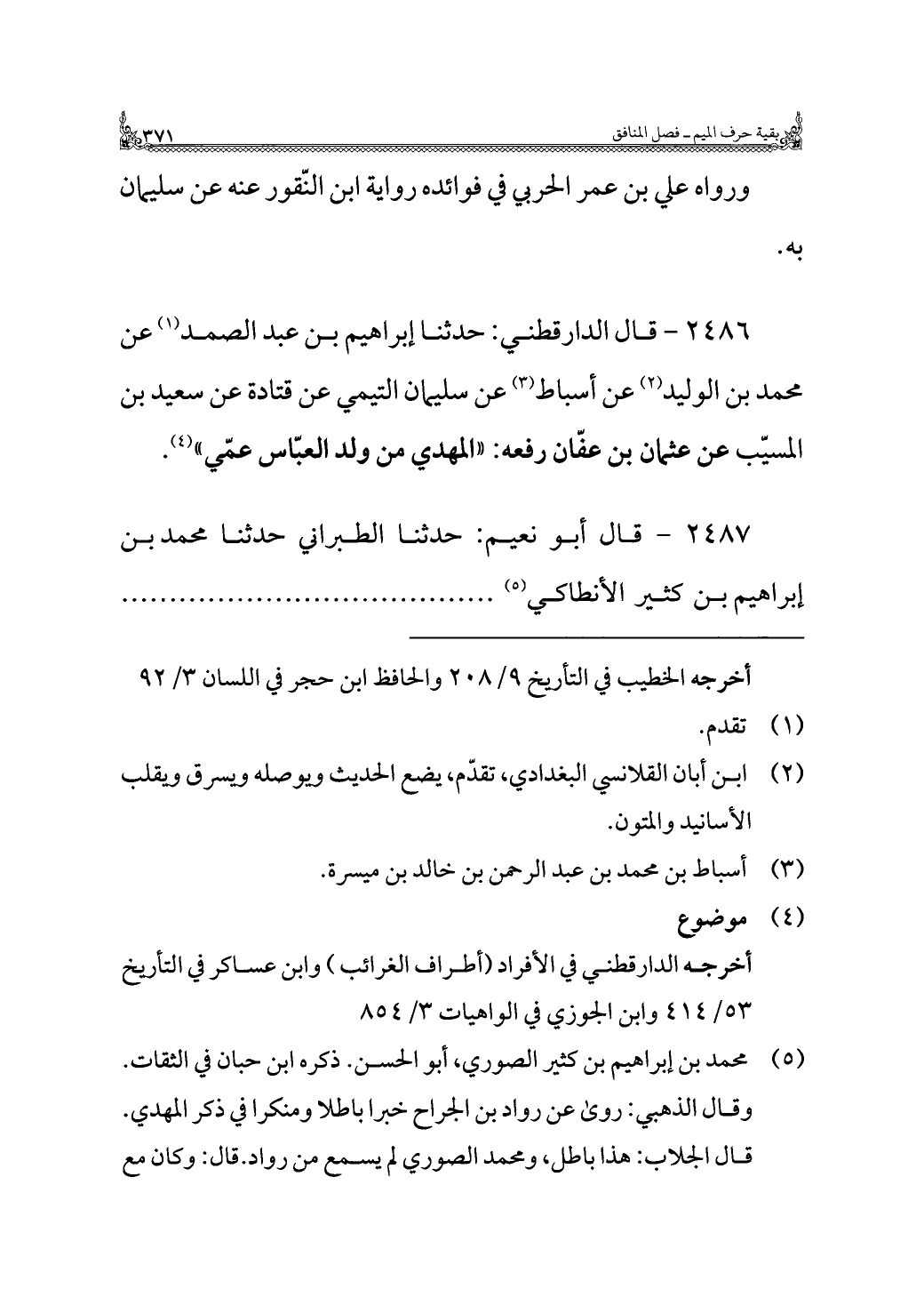 ٢٤٨٦ - قال الدارقطني: حدثنا إبراهيم بن عبد الصمد (¬١) عن محمد بن الوليد (¬٢) عن أسباط (¬٣) عن سليمان التيمي عن قتادة عن سعيد بن المسيّب عن عثمان بن عفّان رفعه: "المهدي من ولد العبّاس عمّي" (¬٤).