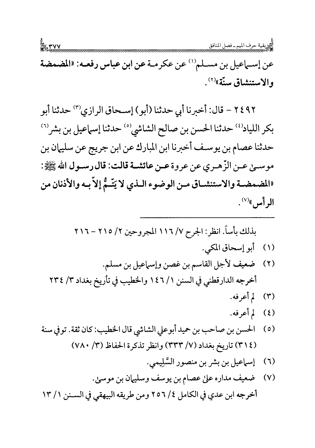 ٢٤٩٢ - قال: أخبرنا أبي حدثنا (أبو) إسحاق الرازي (¬٣) حدثنا أبو بكر اللياد (¬٤) حدثنا الحسن بن صالح الشاشي (¬٥) حدثنا إسماعيل بن بشر (¬٦) حدثنا عصام بن يوسف أخبرنا ابن المبارك عن ابن جريج عن سليمان بن موسى عن الزّهري عن عروة عن عائشة قالت: قال رسول الله -صلي الله عليه وسلم-: "المضمضة والاستنشاق من الوضوء الذي لا يَتّمُّ إلّا به والأذنان من الرأس" (¬٧).