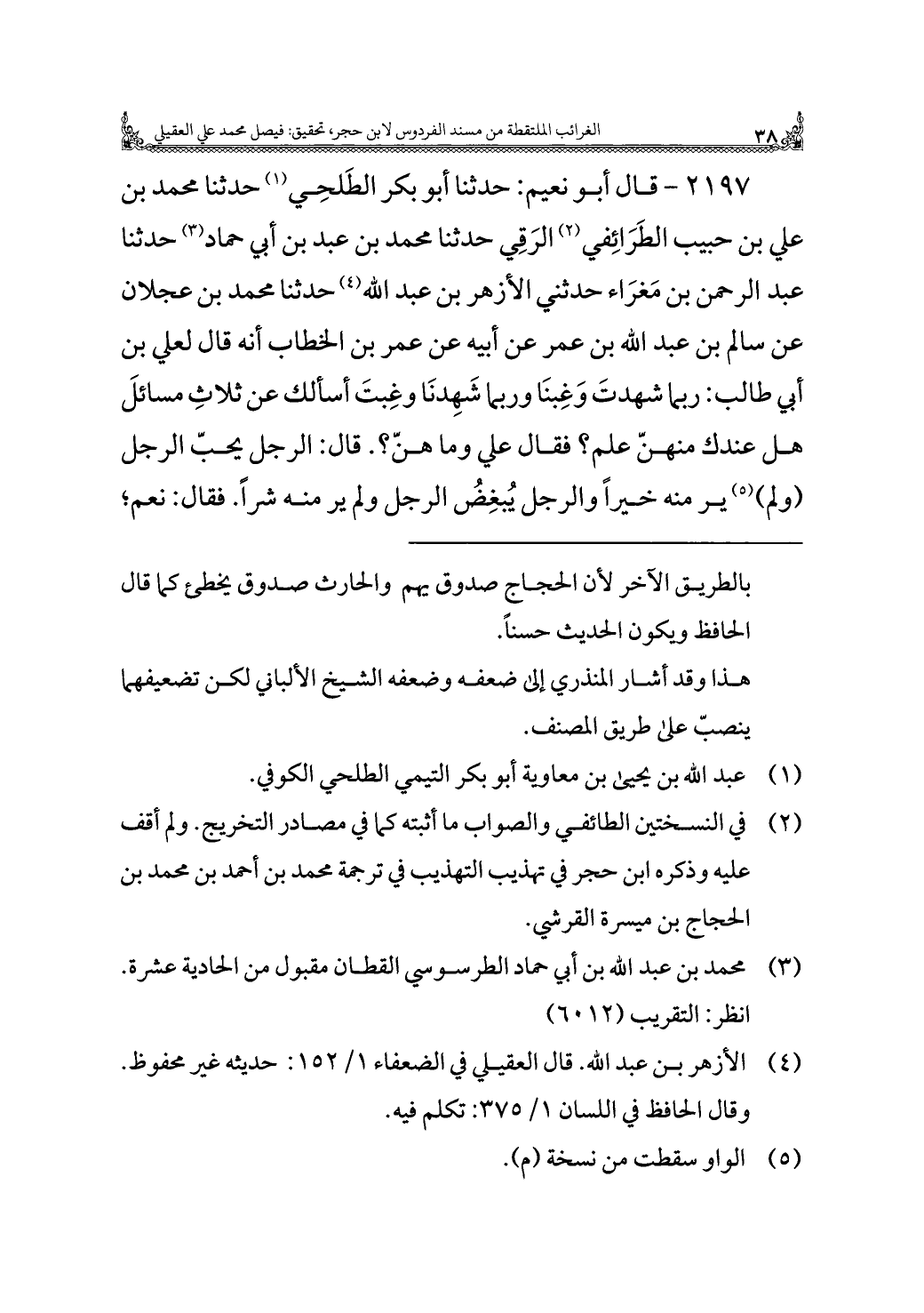 ٢١٩٧ - قال أبو نعيم: حدثنا أبو بكر الطَلحِي (¬١) حدثنا محمد بن علي بن حبيب الطَرَائِفي (¬٢) الرَقِي حدثنا محمد بن عبد بن أبي حماد (¬٣) حدثنا عبد الرحمن بن مَغرَاء حدثني الأزهر بن عبد الله (¬٤) حدثنا محمد بن عجلان عن سالم بن عبد الله بن عمر عن أبيه عن عمر بن الخطاب أنه قال لعلي بن أبي طالب: ربما شهدتَ وَغِبنَا وربما شَهِدنَا وغِبتَ أسألك عن ثلاثِ مسائلَ هل عندك منهنّ علم؟ فقال علي وما هنّ؟ . قال: الرجل يحبّ الرجل (ولم) (¬٥) ير منه خيرًا والرجل يُبغِضُ الرجل ولم ير منه شرًا. فقال: نعم؛