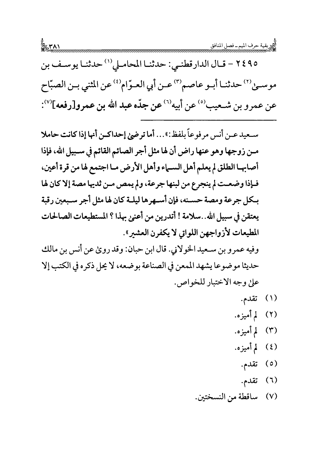 ٢٤٩٥ - قال الدارقطني: حدثنا المحاملي (¬١) حدثنا يوسف بن موسى (¬٢) حدثنا أبو عاصم (¬٣) عن أبي العوّام (¬٤) عن المثني بن الصبّاح عن عمرو بن شعيب (¬٥) عن أبيه (¬٦) عن جدّه عبد الله بن عمرو [رفعه] (¬٧):