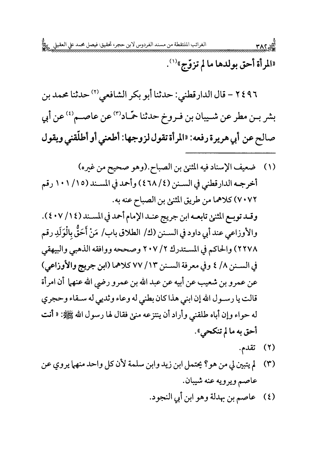 ٢٤٩٦ - قال الدارقطني: حدثنا أبو بكر الشافعي (¬٢) حدثنا محمد بن بشر بن مطر عن شيبان بن فروخ حدثنا حمّاد (¬٣) عن عاصم (¬٤) عن أبي صالح عن أبي هريرة رفعه: "المرأة تقول لزوجها: أطعني أو أطلّقني ويقول