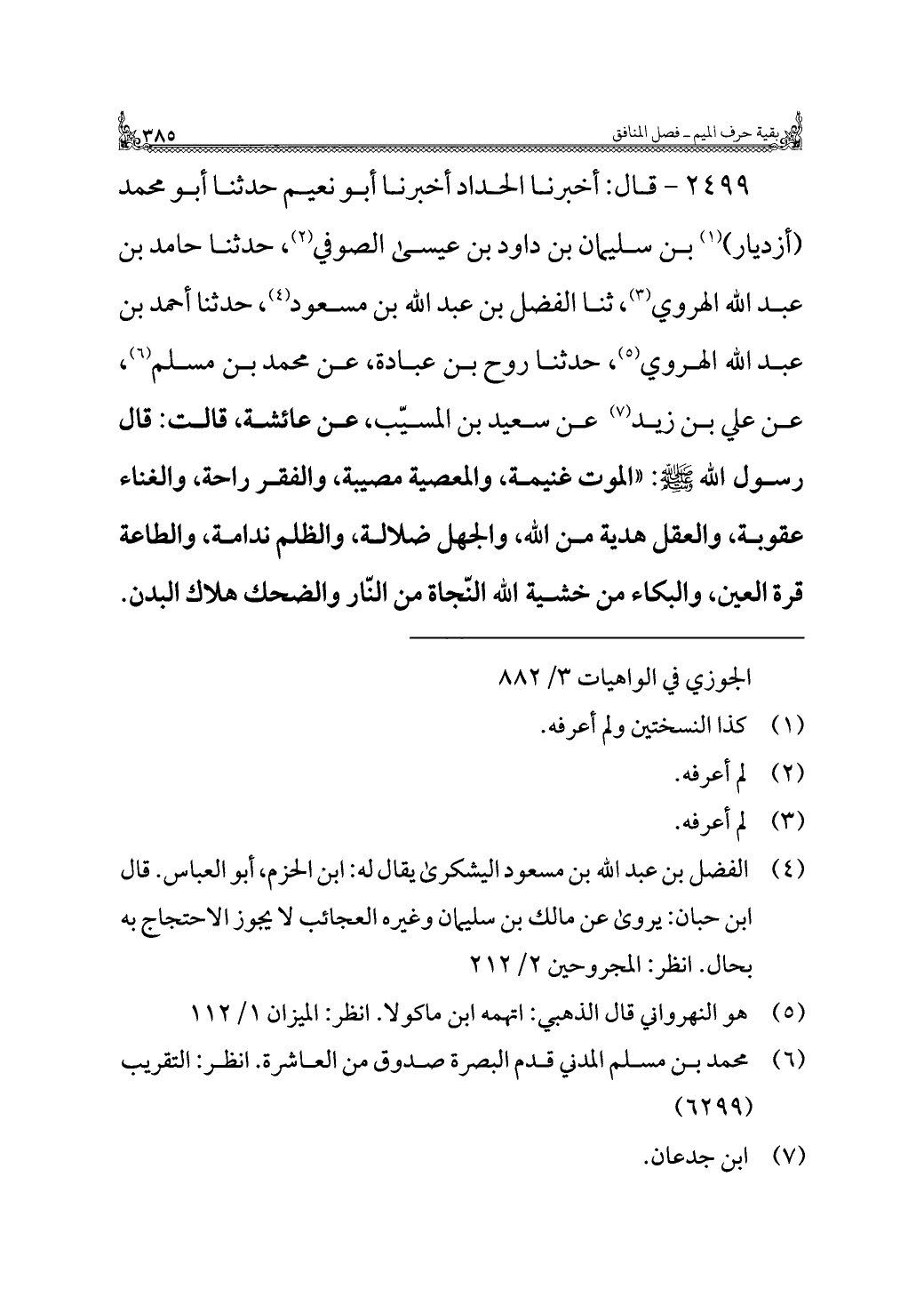 (¬٤) الفضل بن عبد الله بن مسعود اليشكرى يقال له: ابن الحزم، أبو العباس. قال ابن حبان: يروى عن مالك بن سليمان وغيره العجائب لا يجوز الاحتجاج به بحال. انظر: المجروحين ٢/ ٢١٢.