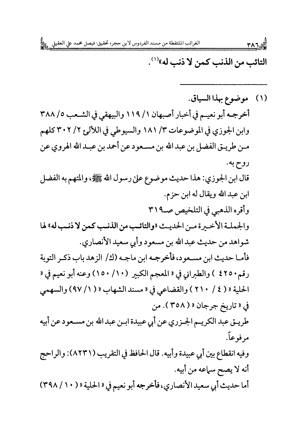 فأما حديث ابن مسعود، فأخرجه ابن ماجه (ك/ الزهد باب ذكر التوبة رقم ٤٢٥٠) والطبراني في "المعجم الكبير (١٠/ ١٥٠) وعنه أبو نعيم في" الحلية" (٤/ ٢١٠) والقضاعي في "مسند الشهاب" (١/ ٩٧) والسهمي في "تأريخ جرجان" (٣٥٨). من طريق عبد الكريم الجزري عن أبي عبيدة ابن عبد الله بن مسعود عن أبيه مرفوعًا.