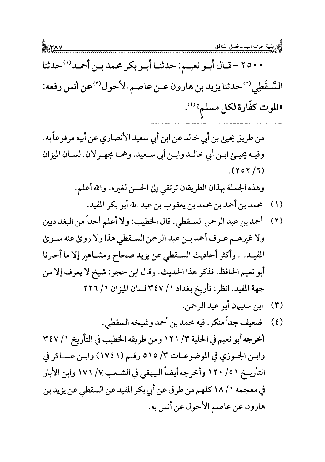 ٢٥٠٠ - قال أبو نعيم: حدثنا أبو بكر محمد بن أحمد (¬١) حدثنا السَّقَطِي (¬٢) حدثنا يزيد بن هارون عن عاصم الأحول (¬٣) عن أنس رفعه: "الموت كفّارة لكل مسلمٍ" (¬٤).