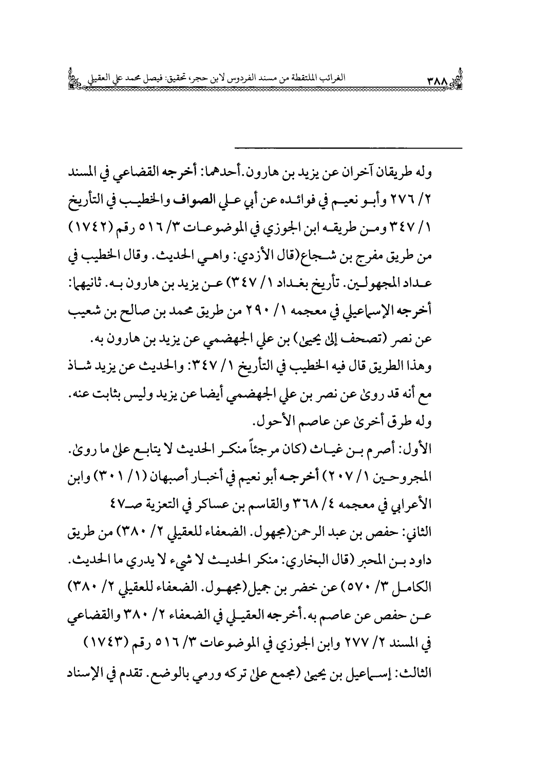 = وله طريقان آخران عن يزيد بن هارون. أحدهما: أخرجه القضاعي في المسند ٢/ ٢٧٦ وأبو نعيم في فوائده عن أبي علي الصواف والخطيب في التأريخ ١/ ٣٤٧ ومن طريقه ابن الجوزي في الموضوعات ٣/ ٥١٦ رقم (١٧٤٢) من طريق مفرج بن شجاع (قال الأزدي: واهي الحديث. وقال الخطيب في عداد المجهولين. تأريخ بغداد ١/ ٣٤٧) عن يزيد بن هارون به. ثانيهما: أخرجه الإسماعيلي في معجمه ١/ ٢٩٠ من طريق محمد بن صالح بن شعيب عن نصر (تصحف إلى يحيي) بن علي الجهضمي عن يزيد بن هارون به.