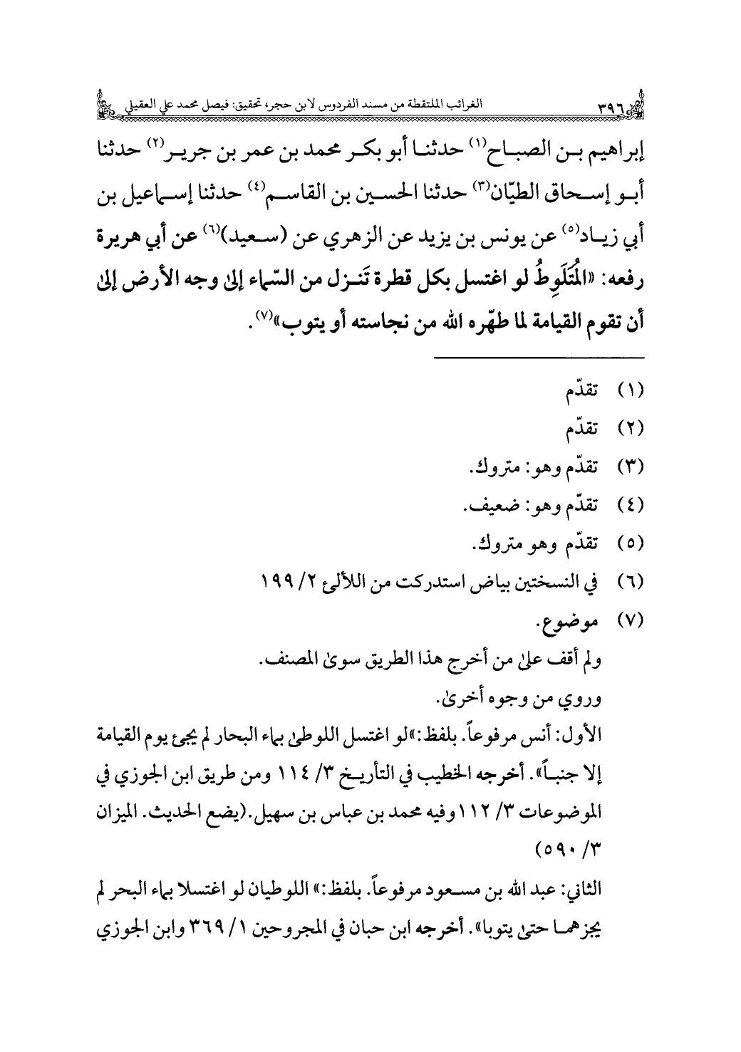 إبراهيم بن الصباح (¬١) حدثنا أبو بكر محمد بن عمر بن جرير (¬٢) حدثنا أبو إسحاق الطيّان (¬٣) حدثنا الحسين بن القاسم (¬٤) حدثنا إسماعيل بن أبي زياد (¬٥) عن يونس بن يزيد عن الزهري عن (سعيد) (¬٦) عن أبي هريرة رفعه: "المُتَلَوِطُ لو اغتسل بكل قطرة تَنزل من السّماء إلي وجه الأرض إلي أن تقوم القيامة لما طهّره الله من نجاسته أو يتوب" (¬٧).