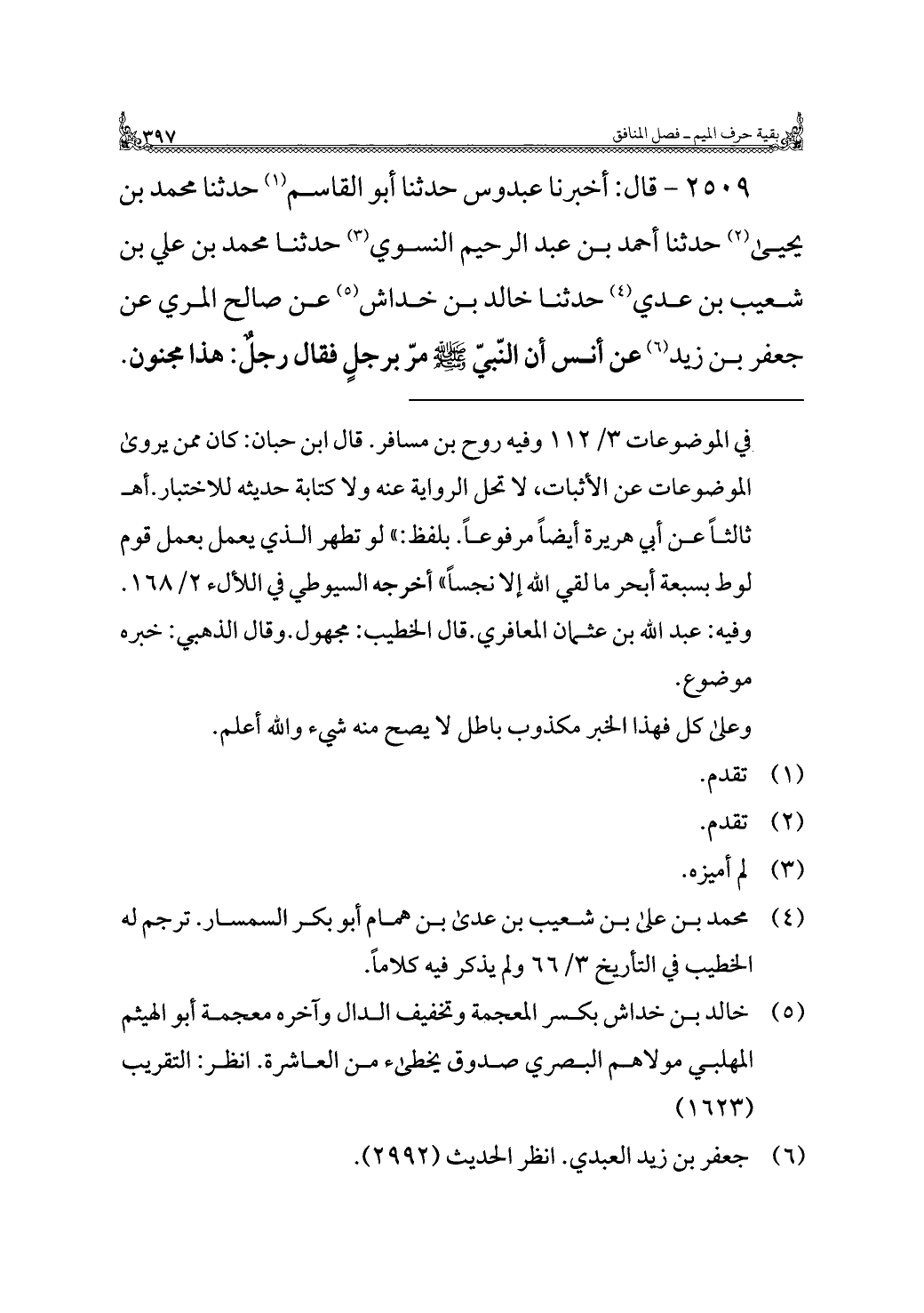 ٢٥٠٩ - قال: أخبرنا عبدوس حدثنا أبو القاسم (¬١) حدثنا محمد بن يحيى (¬٢) حدثنا أحمد بن عبد الرحيم النسوي (¬٣) حدثنا محمد بن علي بن شعيب بن عدي (¬٤) حدثنا خالد بن خداش (¬٥) عن صالح المري عن جعفر بن زيد (¬٦) عن أنس أن النّبيّ -صلي الله عليه وسلم- مرّ برجلٍ فقال رجلٌ: هذا مجنون.