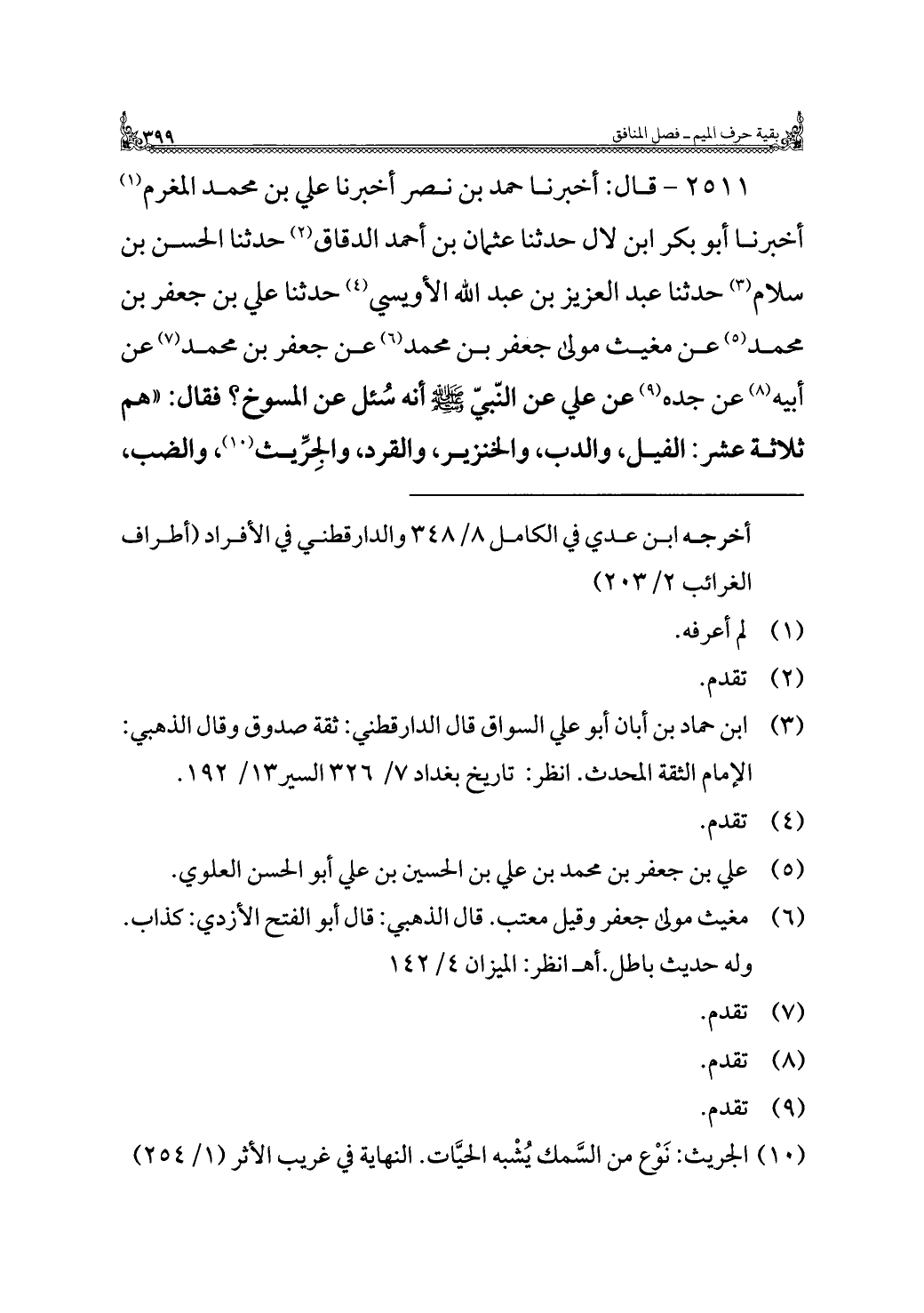 ٢٥١١ - قال: أخبرنا حمد بن نصر أخبرنا علي بن محمد المغرم (¬١) أخبرنا أبو بكر ابن لال حدثنا عثمان بن أحمد الدقاق (¬٢) حدثنا الحسن بن سلام (¬٣) حدثنا عبد العزيز بن عبد الله الأويسي (¬٤) حدثنا علي بن جعفر بن محمد (¬٥) عن مغيث مولى جعفر بن محمد (¬٦) عن جعفر بن محمد (¬٧) عن أبيه (¬٨) عن جده (¬٩) عن علي عن النّبيّ -صلي الله عليه وسلم- أنه سُئل عن المسوخ؟ فقال: "هم ثلاثة عشر: الفيل، والدب، والخنزير، والقرد، والجِرِّيث (¬١٠)، والضب،