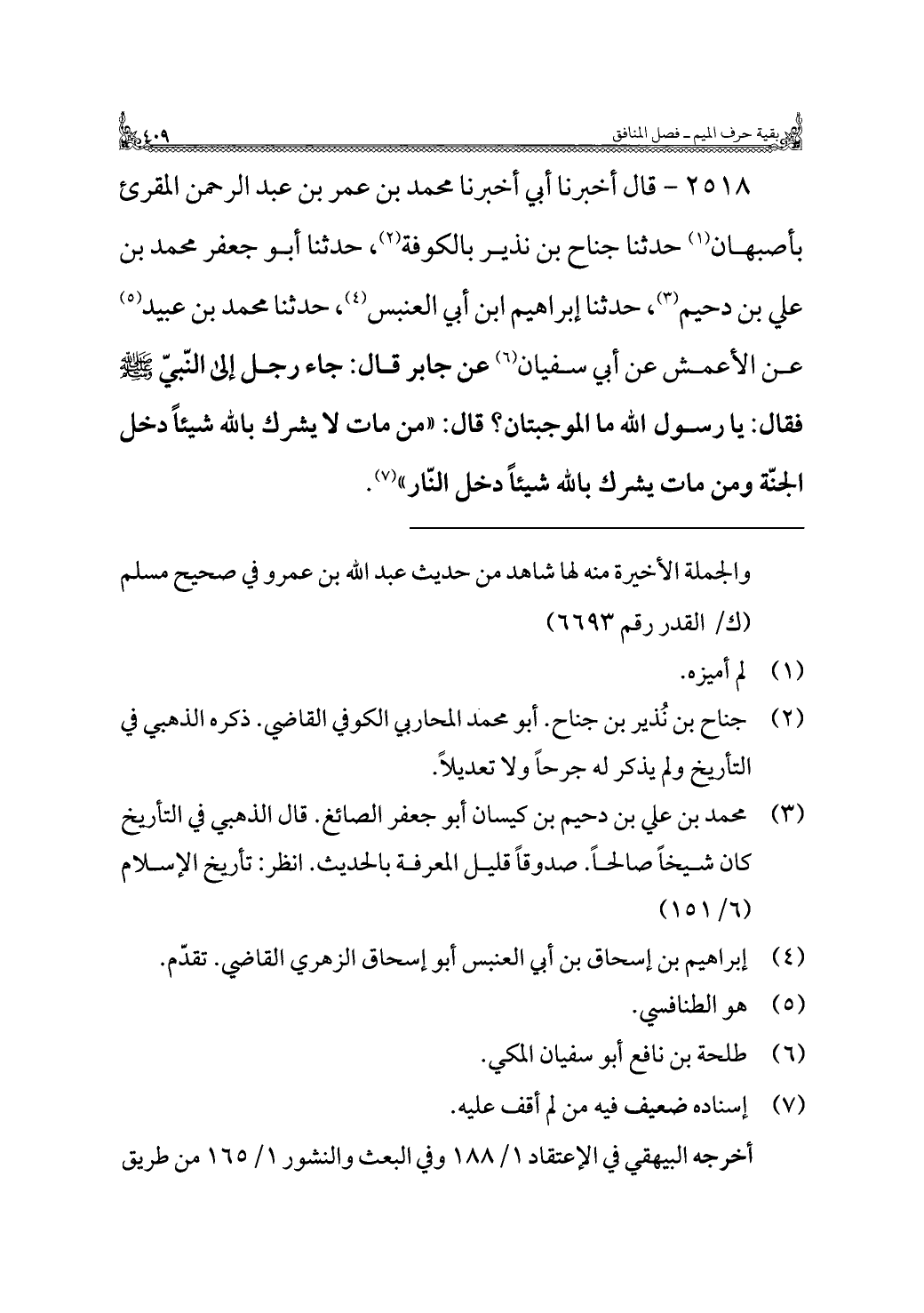 ٢٥١٨ - قال أخبرنا أبي أخبرنا محمد بن عمر بن عبد الرحمن المقرئ بأصبهان (¬١) حدثنا جناح بن نذير بالكوفة (¬٢)، حدثنا أبو جعفر محمد بن علي بن دحيم (¬٣)، حدثنا إبراهيم ابن أبي العنبس (¬٤)، حدثنا محمد بن عبيد (¬٥) عن الأعمش عن أبي سفيان (¬٦) عن جابر قال: جاء رجل إلي النّبيّ -صلي الله عليه وسلم- فقال: يا رسول الله ما الموجبتان؟ قال: "من مات لا يشرك بالله شيئًا دخل الجنّة ومن مات يشرك بالله شيئًا دخل النّار" (¬٧).