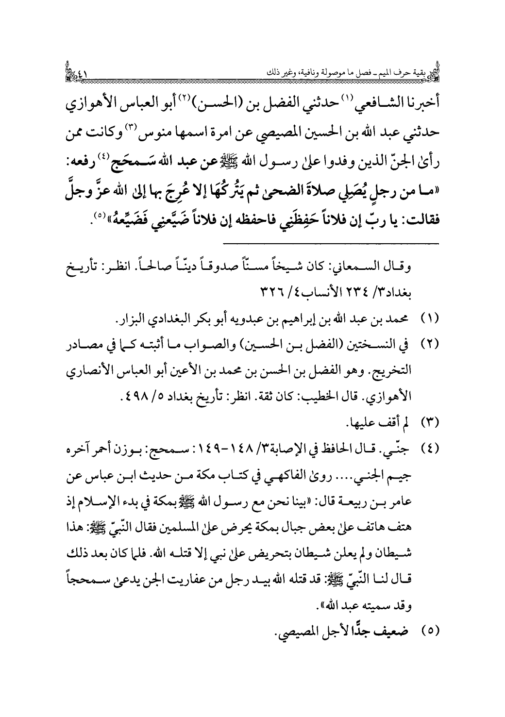أخبرنا الشافعي (¬١) حدثني الفضل بن (الحسن) (¬٢) أبو العباس الأهوازي حدثني عبد الله بن الحسين المصيصي عن امرة اسمها منوس (¬٣) وكانت ممن رأى الجنّ الذين وفدوا علي رسول الله -صلى الله عليه وسلم- عن عبد الله سَمحَج (¬٤) رفعه: "ما من رجل يُصَلي صلاةَ الضحي ثم يَتُركُهَا إلا عُرِجَ بها إلى الله عزَّ وجلَّ فقالت: يا ربّ إن فلانًا حَفِظَنِي فاحفظه إن فلانًا ضَيَّعنِي فَضَيِّعهُ" (¬٥).