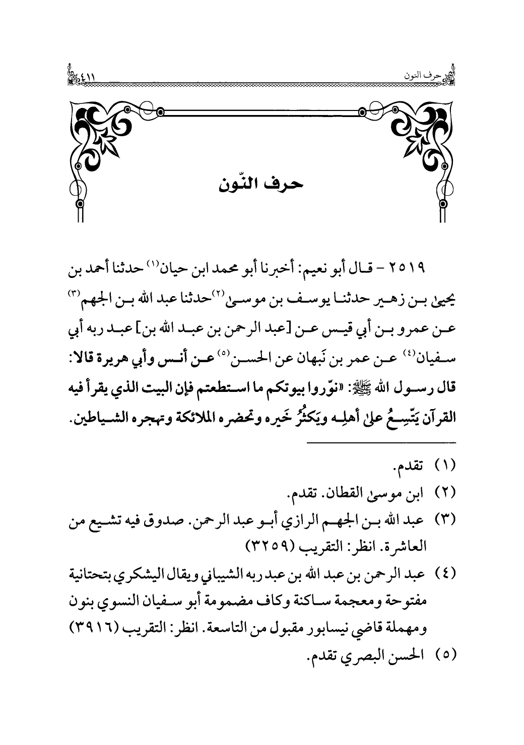 ٢٥١٩ - قال أبو نعيم: أخبرنا أبو محمد ابن حيان (¬١) حدثنا أحمد بن يحيى بن زهير حدثنا يوسف بن موسى (¬٢) حدثنا عبد الله بن الجهم (¬٣) عن عمرو بن أبي قيس عن [عبد الرحمن بن عبد الله بن] عبد ربه أبي سفيان (¬٤) عن عمر بن نَبهان عن الحسن (¬٥) عن أنس وأبي هريرة قالا: قال رسول الله -صلى الله عليه وسلم-: "نوّروا بيوتكم ما استطعتم فإن البيت الذي يقرأ فيه القرآن يَتّسِعُ على أهلِه ويَكثُرُ خَيره وتحضره الملائكة وتهجره الشياطين.
