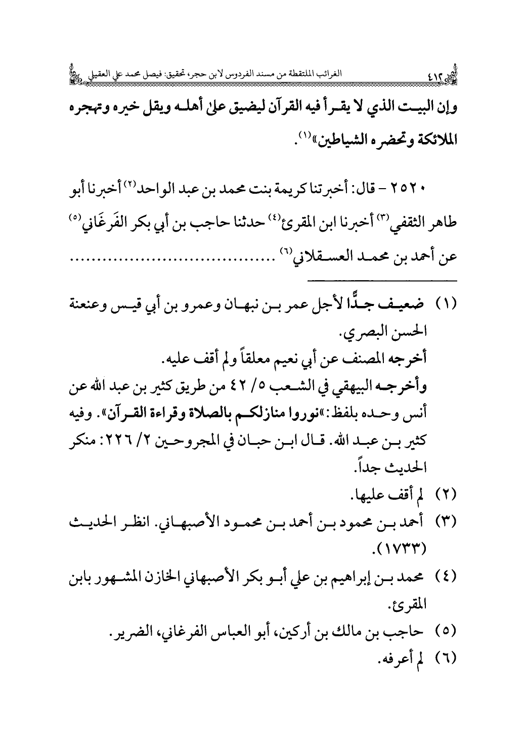 ٢٥٢٠ - قال: أخبرتنا كريمة بنت محمد بن عبد الواحد (¬٢) أخبرنا أبو طاهر الثقفي (¬٣) أخبرنا ابن المقرئ (¬٤) حدثنا حاجب بن أبي بكر الفَرغَاني (¬٥) عن أحمد بن محمد العسقلاني (¬٦) ......................................