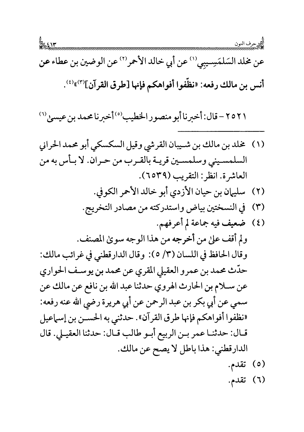 عن مخلد السَلمَسِيبِي (¬١) عن أبي خالد الأحمر (¬٢) عن الوضين بن عطاء عن أنس بن مالك رفعه: "نظّفوا أفواهكم فإنها [طرق القرآن] (¬٣) " (¬٤).