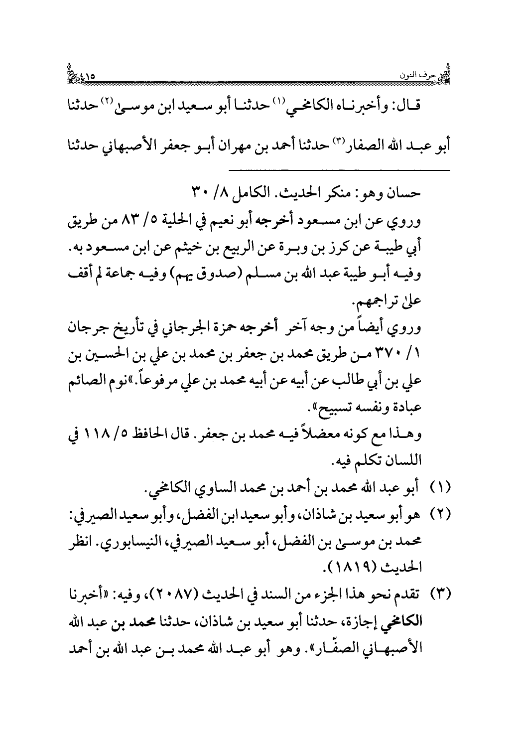 قال: وأخبرناه الكامخي (¬١) حدثنا أبو سعيد ابن موسى (¬٢) حدثنا أبو عبد الله الصفار (¬٣) حدثنا أحمد بن مهران أبو جعفر الأصبهاني حدثنا