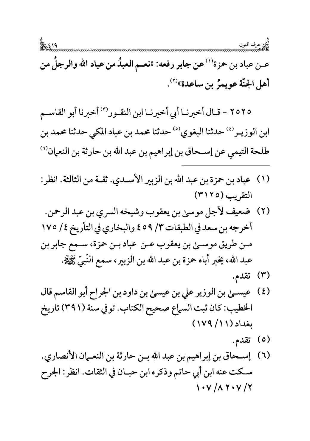 ٢٥٢٥ - قال أخبرنا أبي أخبرنا ابن النقور (¬٣) أخبرنا أبو القاسم ابن الوزير (¬٤) حدثنا البغوي (¬٥) حدثنا محمد بن عباد المكي حدثنا محمد بن طلحة التيمي عن إسحاق بن إبراهيم بن عبد الله بن حارثة بن النعمان (¬٦)