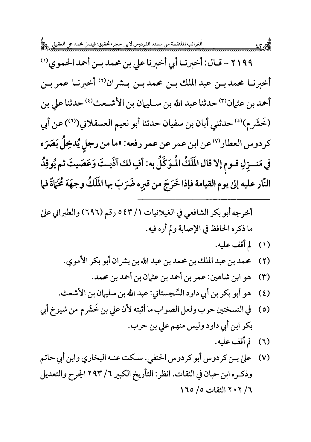 ٢١٩٩ - قال: أخبرنا أبي أخبرنا علي بن محمد بن أحمد الحموي (¬١) أخبرنا محمد بن عبد الملك بن محمد بن بشران (¬٢) أخبرنا عمر بن أحمد بن عثمان (¬٣) حدثنا عبد الله بن سليمان بن الأشعث (¬٤) حدثنا علي بن (خَشَرم) (¬٥) حدثني أبان بن سفيان حدثنا أبو نعيم العسقلاني ((¬٦)) عن أبي كردوس العطار (¬٧) عن ابن عمر عن عمر رفعه: "ما من رجلٍ يُدخِلُ بَصَرَه في مَنزِلِ قومٍ إلا قال الَمَلَكُ المُوَكَّلُ به: أفٍ لك آذَيتَ وَعَصَيتَ ثم يُوقِدُ النّار عليه إلى يوم القيامة فإذا خَرَجَ من قبره ضَرَبَ بها الَمَلَكُ وجهَهَ مُحَمَاةً فما