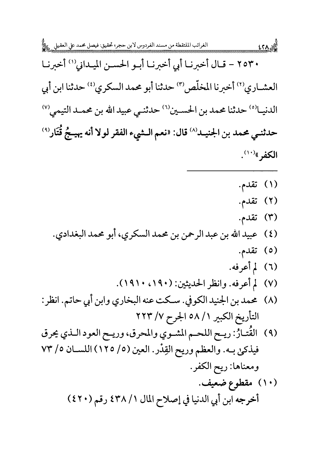 ٢٥٣٠ - قال أخبرنا أبي أخبرنا أبو الحسن الميداني (¬١) أخبرنا العشاري (¬٢) أخبرنا المخلّص (¬٣) حدثنا أبو محمد السكري (¬٤) حدثنا ابن أبي الدنيا (¬٥) حدثنا محمد بن الحسين (¬٦) حدثني عبيد الله بن محمد التيمي (¬٧) حدثني محمد بن الجنيد (¬٨) قال: "نعم الشيء الفقر لولا أنه يهيجُ قُتَار (¬٩) الكفر" (¬١٠).