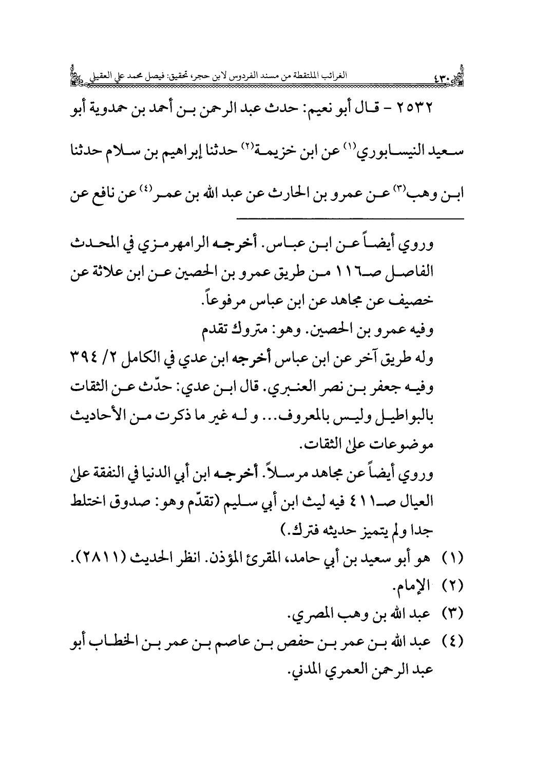 ٢٥٣٢ - قال أبو نعيم: حدث عبد الرحمن بن أحمد بن حمدوية أبو سعيد النيسابوري (¬١) عن ابن خزيمة (¬٢) حدثنا إبراهيم بن سلام حدثنا ابن وهب (¬٣) عن عمرو بن الحارث عن عبد الله بن عمر (¬٤) عن نافع عن