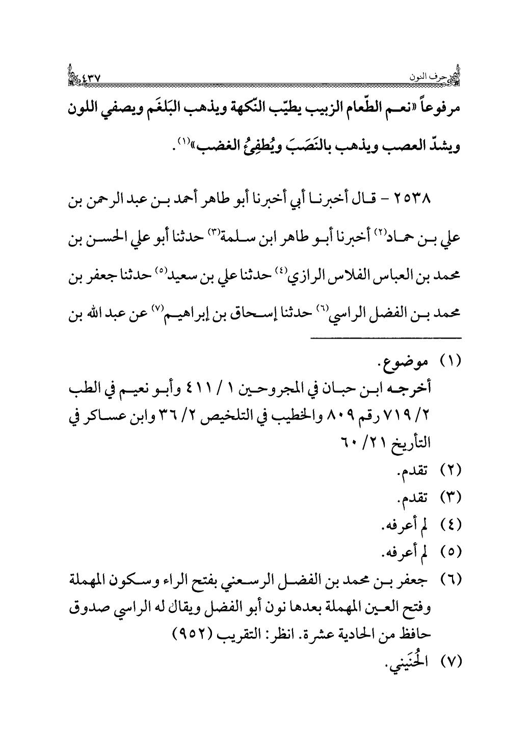 ٢٥٣٨ - قال أخبرنا أبي أخبرنا أبو طاهر أحمد بن عبد الرحمن بن علي بن حماد (¬٢) أخبرنا أبو طاهر ابن سلمة (¬٣) حدثنا أبو علي الحسن بن محمد بن العباس الفلاس الرازي (¬٤) حدثنا علي بن سعيد (¬٥) حدثنا جعفر بن محمد بن الفضل الراسى (¬٦) حدثنا إسحاق بن إبراهيم (¬٧) عن عبد الله بن