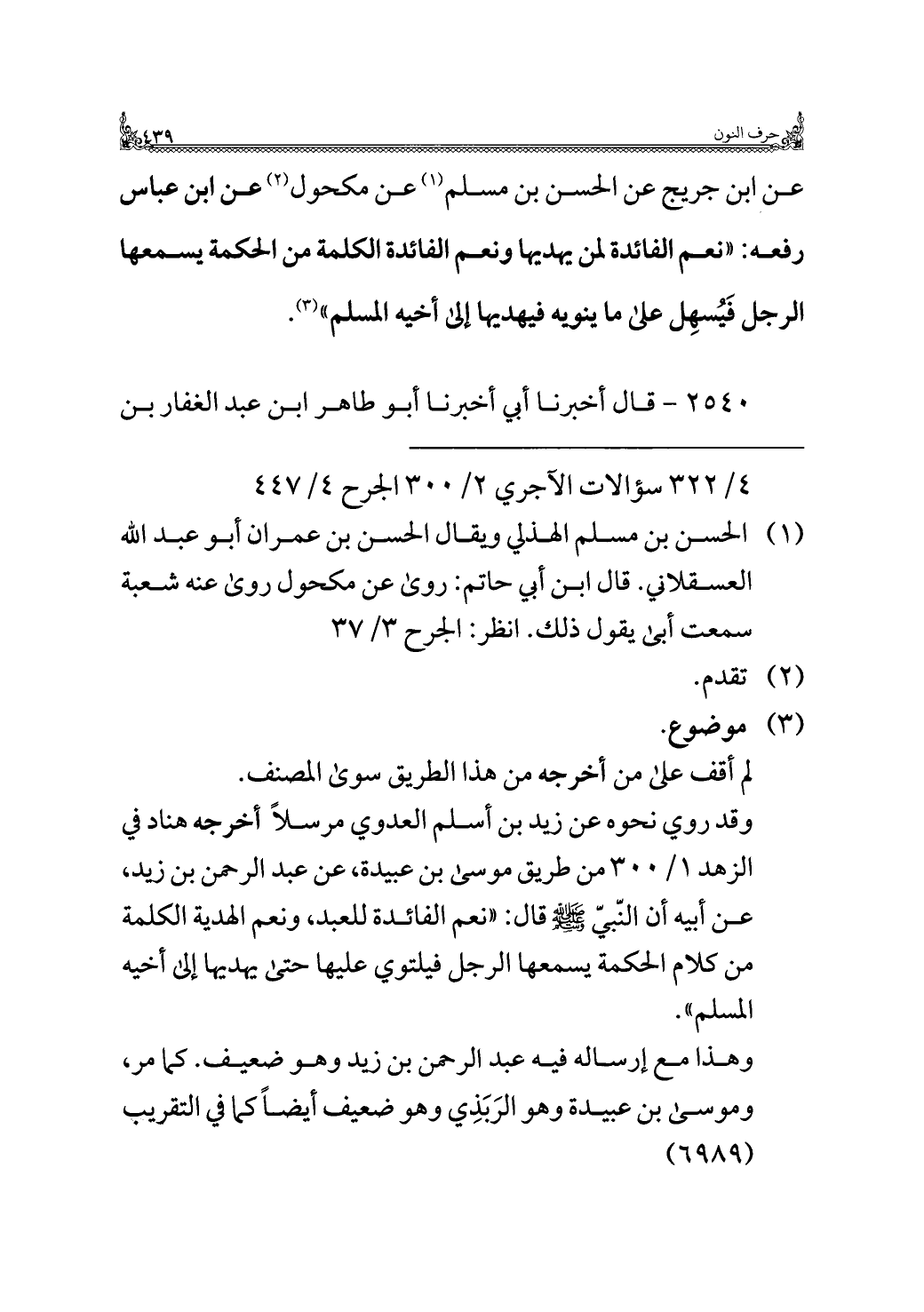 عن ابن جريج عن الحسن بن مسلم (¬١) عن مكحول (¬٢) عن ابن عباس رفعه: "نعم الفائدة لمن يهديها ونعم الفائدة الكلمة من الحكمة يسمعها الرجل فَيُسهِل على ما ينويه فيهديها إلى أخيه المسلم" (¬٣).