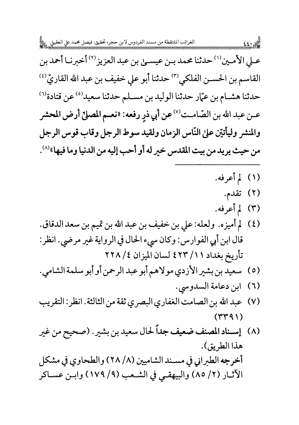 علي الأمين (¬١) حدثنا محمد بن عيسى بن عبد العزيز (¬٢) أخبرنا أحمد بن القاسم بن الحسن الفلكي (¬٣) حدثنا أبو علي خفيف بن عبد الله القاريّ (¬٤) حدثنا هشام بن عمّار حدثنا الوليد بن مسلم حدثنا سعيد (¬٥) عن قتادة (¬٦) عن عبد الله بن الصّامت (¬٧) عن أبي ذرٍ رفعه: "نعم المصلىّ أرض المحشر والمنشر وليأتيّن على النّاس الزمان ولقيد سوط الرجل وقاب قوس الرجل من حيث يريد من بيت المقدس خير له أو أحب إليه من الدنيا وما فيها" (¬٨).