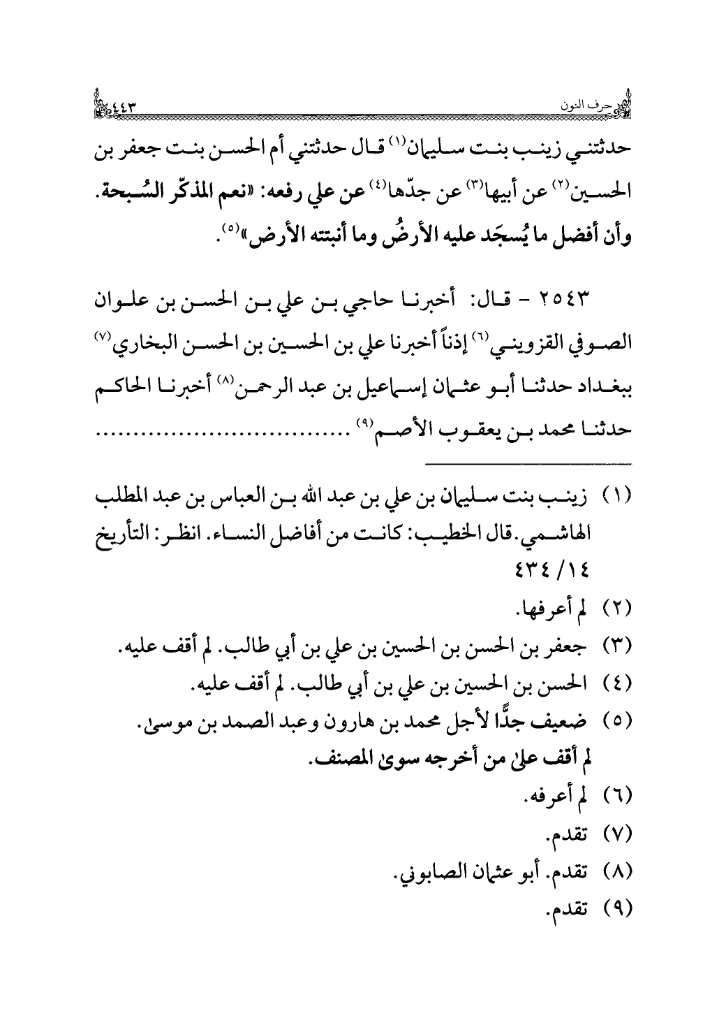 حدثتني زينب بنت سليمان (¬١) قال حدثتني أم الحسن بنت جعفر بن الحسين (¬٢) عن أبيها (¬٣) عن جدّها (¬٤) عن علي رفعه: "نعم المذكّر السُبحة. وأن أفضل ما يُسجَد عليه الأرضُ وما أنبتته الأرض" (¬٥).