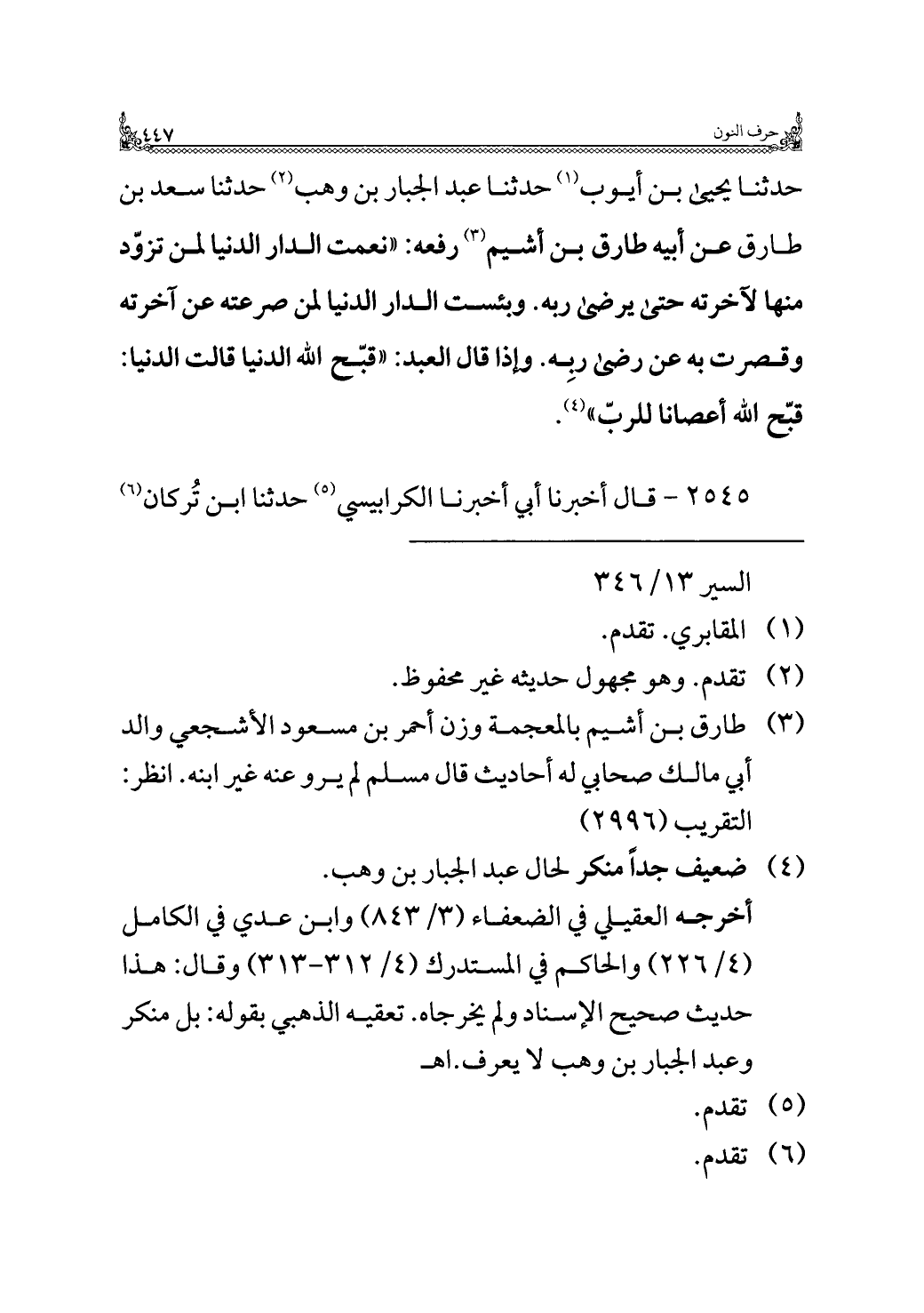 حدثنا يحيى بن أيوب (¬١) حدثنا عبد الجبار بن وهب (¬٢) حدثنا سعد بن طارق عن أبيه طارق بن أشيم (¬٣) رفعه: "نعمت الدار الدنيا لمن تزوّد منها لآخرته حتى يرضى ربه. وبئست الدار الدنيا لمن صرعته عن آخرته وقصرت به عن رضى ربِه. وإذا قال العبد: "قبّح الله الدنيا قالت الدنيا: قبّح الله أعصانا للربّ" (¬٤).