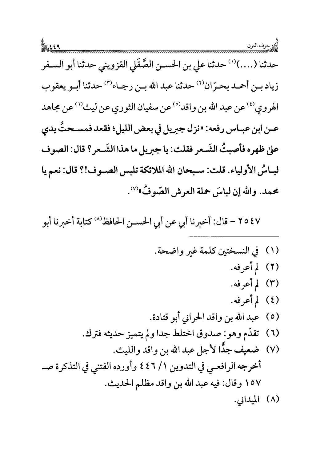 حدثنا ( .... ) (¬١) حدثنا علي بن الحسن الصَّقَلي القزويني حدثنا أبو السفر زياد بن أحمد بحرّان (¬٢) حدثنا عبد الله بن رجاء (¬٣) حدثنا أبو يعقوب الهروي (¬٤) عن عبد الله بن واقد (¬٥) عن سفيان الثوري عن ليث (¬٦) عن مجاهد عن ابن عباس رفعه: "نزل جبريل في بعض الليل؛ فقعد فمسحتُ يدي على ظهره فأصبتُ الشَعر فقلت: يا جبريل ما هذا الشَعر؟ قال: الصوف لباسُ الأولياء. قلت: سبحان الله الملائكة تلبس الصوف! ؟ قال: نعم يا محمد. والله إن لباسَ حملة العرش الصّوفُ" (¬٧).